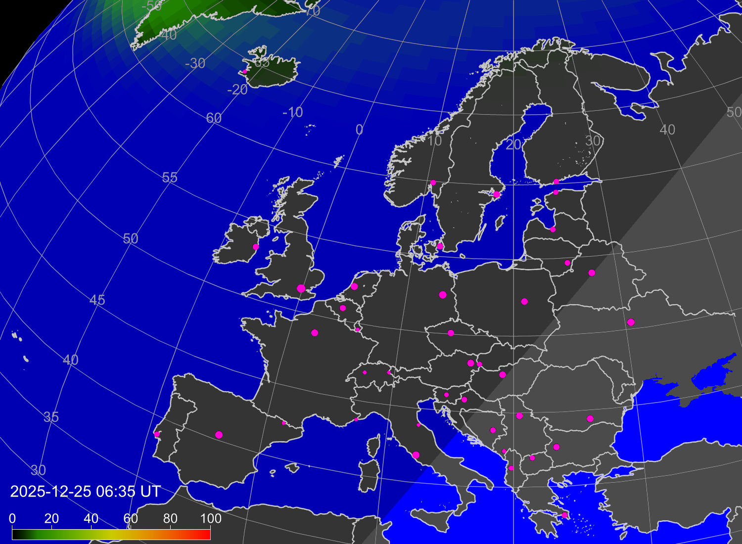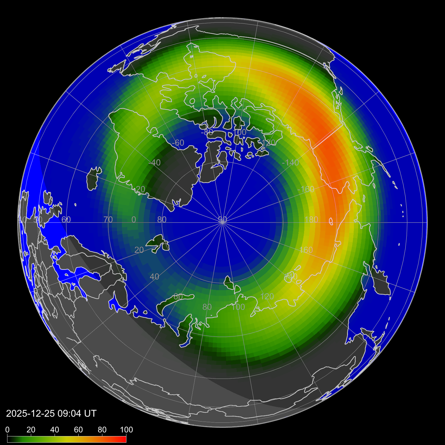 Изменения и часовой прогноз индекса интенсивности полярных сияний с 2025-12-24 по 2025-12-25