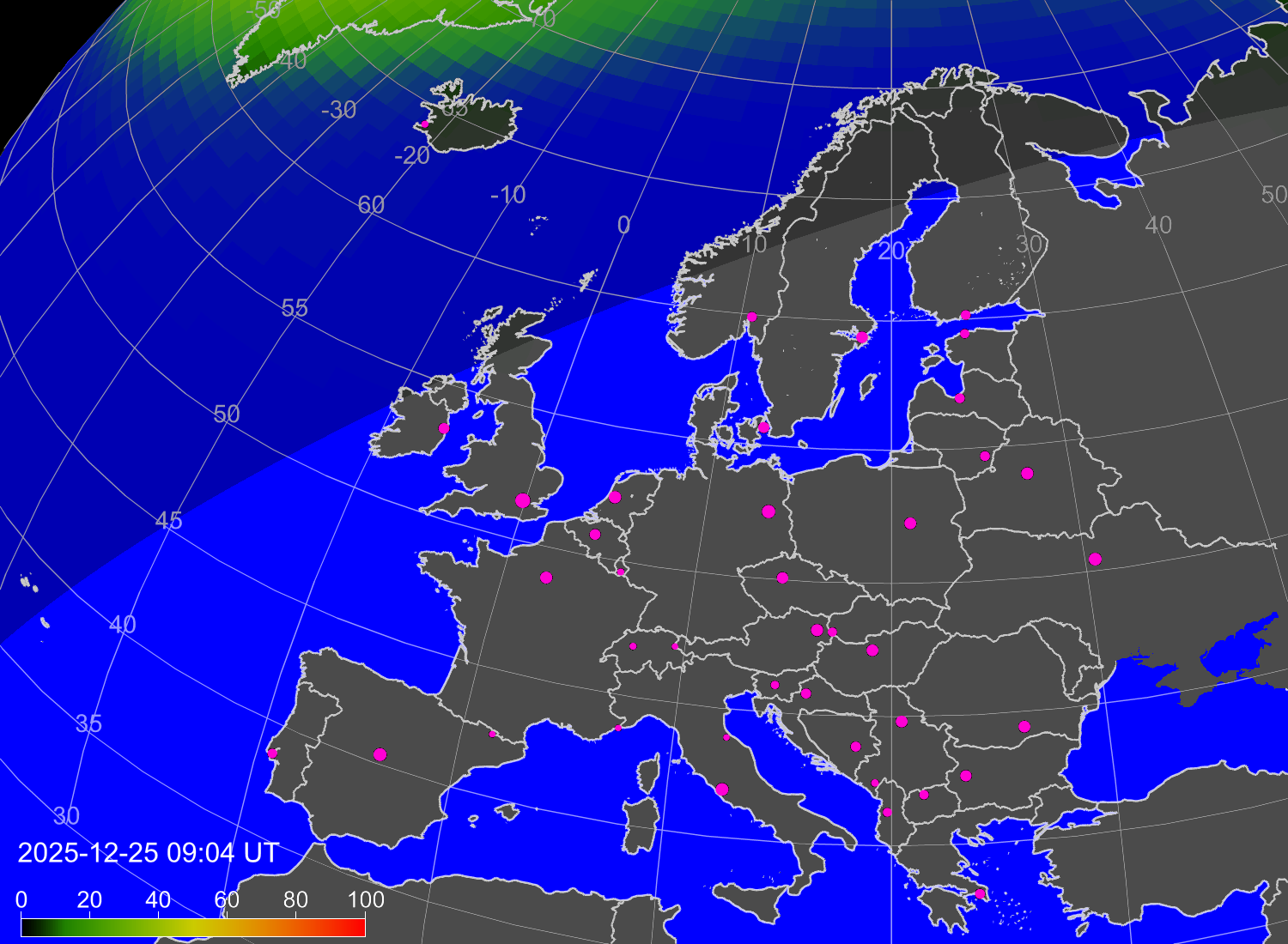 Индекс интенсивности полярных сияний и теоретически возможная широта наблюдений для ночного времени в восточном полушарии
