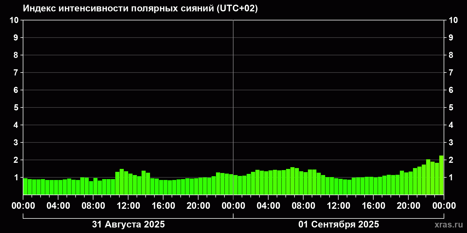 Изменения индекса интенсивности полярных сияний с 2025-08-31 по 2025-09-01 по местному времени