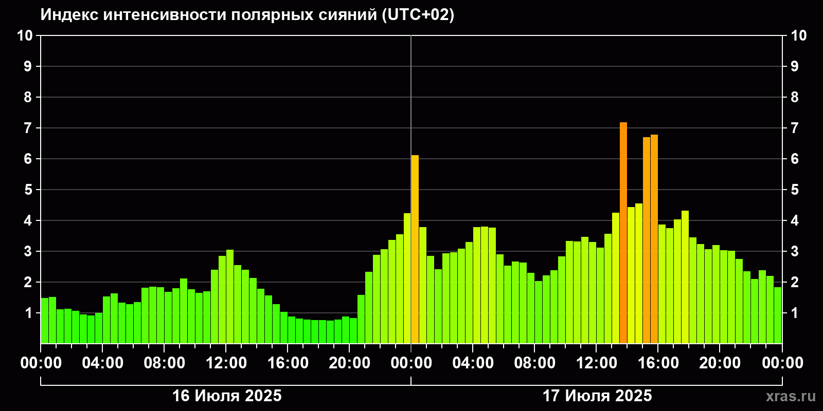Изменения индекса интенсивности полярных сияний с 2025-07-16 по 2025-07-17 по местному времени