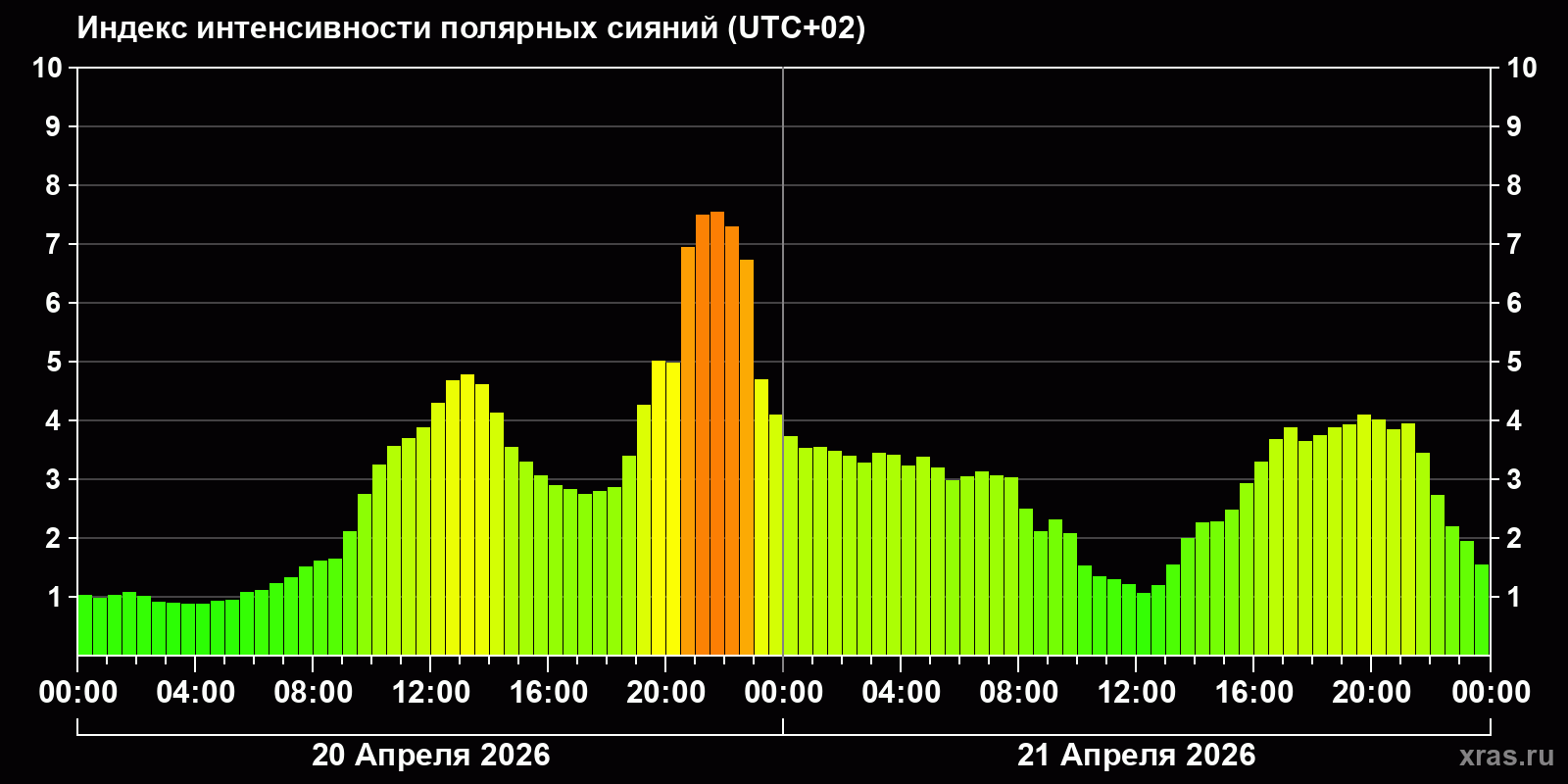 Изменения индекса интенсивности полярных сияний с 2026-04-20 по 2026-04-21 по местному времени