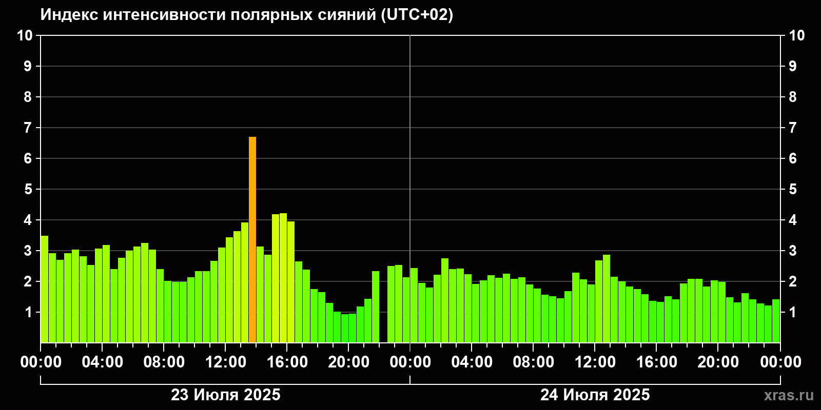 Изменения индекса интенсивности полярных сияний с 2025-07-23 по 2025-07-24 по местному времени