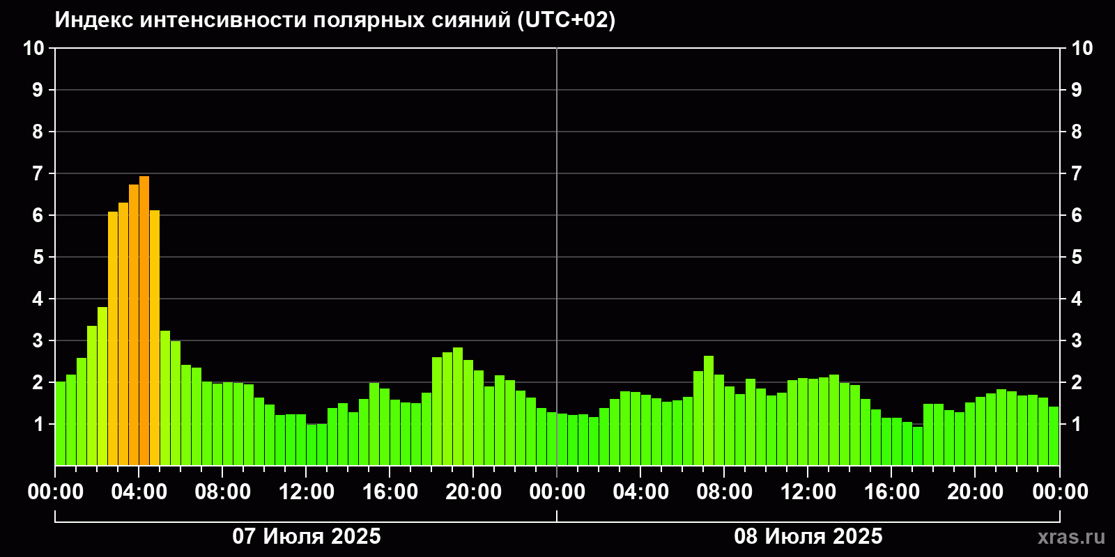 Изменения индекса интенсивности полярных сияний с 2025-07-07 по 2025-07-08 по местному времени