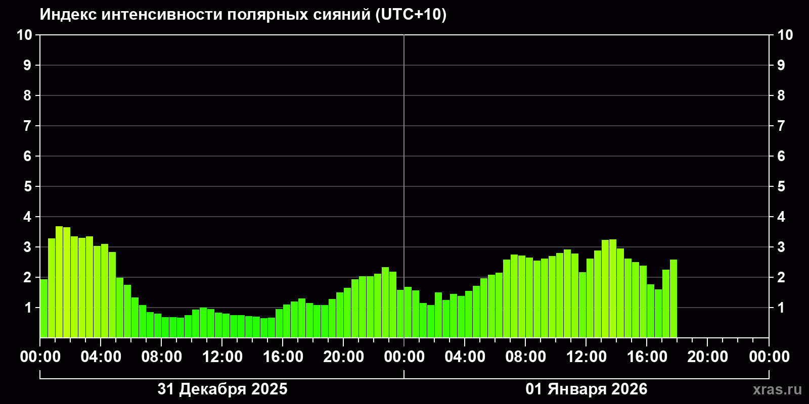 Изменения индекса интенсивности полярных сияний с 2025-12-31 по 2026-01-01 по местному времени