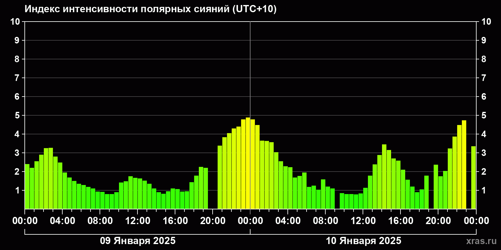 Изменения индекса интенсивности полярных сияний с 2025-01-09 по 2025-01-10 по местному времени