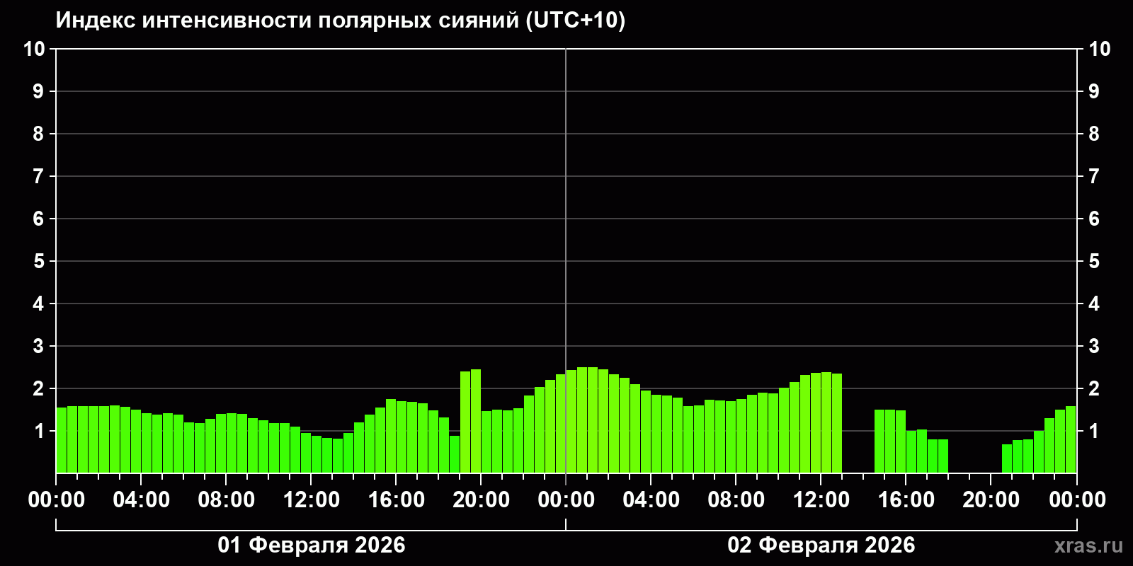 Изменения индекса интенсивности полярных сияний с 2026-02-01 по 2026-02-02 по местному времени
