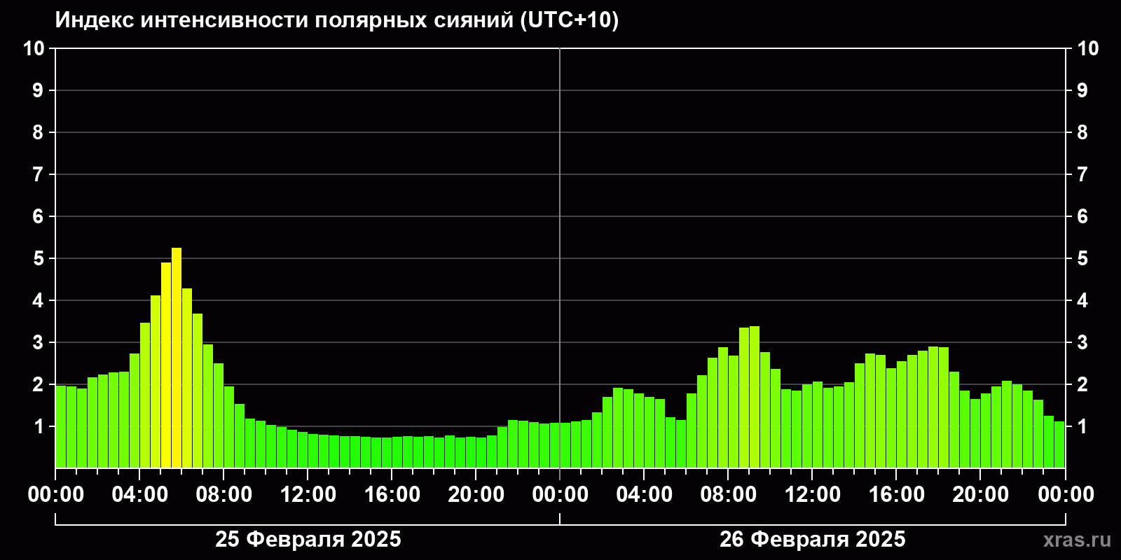 Изменения индекса интенсивности полярных сияний с 2025-02-25 по 2025-02-26 по местному времени
