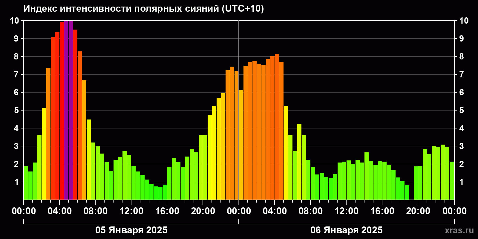 Изменения индекса интенсивности полярных сияний с 2025-01-05 по 2025-01-06 по местному времени