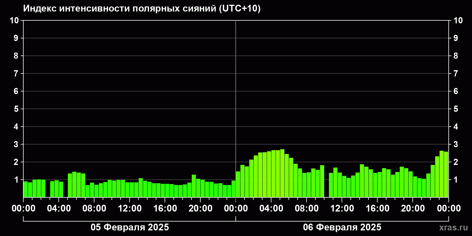 Изменения индекса интенсивности полярных сияний с 2025-02-05 по 2025-02-06 по местному времени