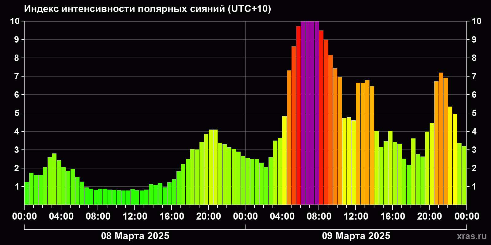 Изменения индекса интенсивности полярных сияний с 2025-03-08 по 2025-03-09 по местному времени