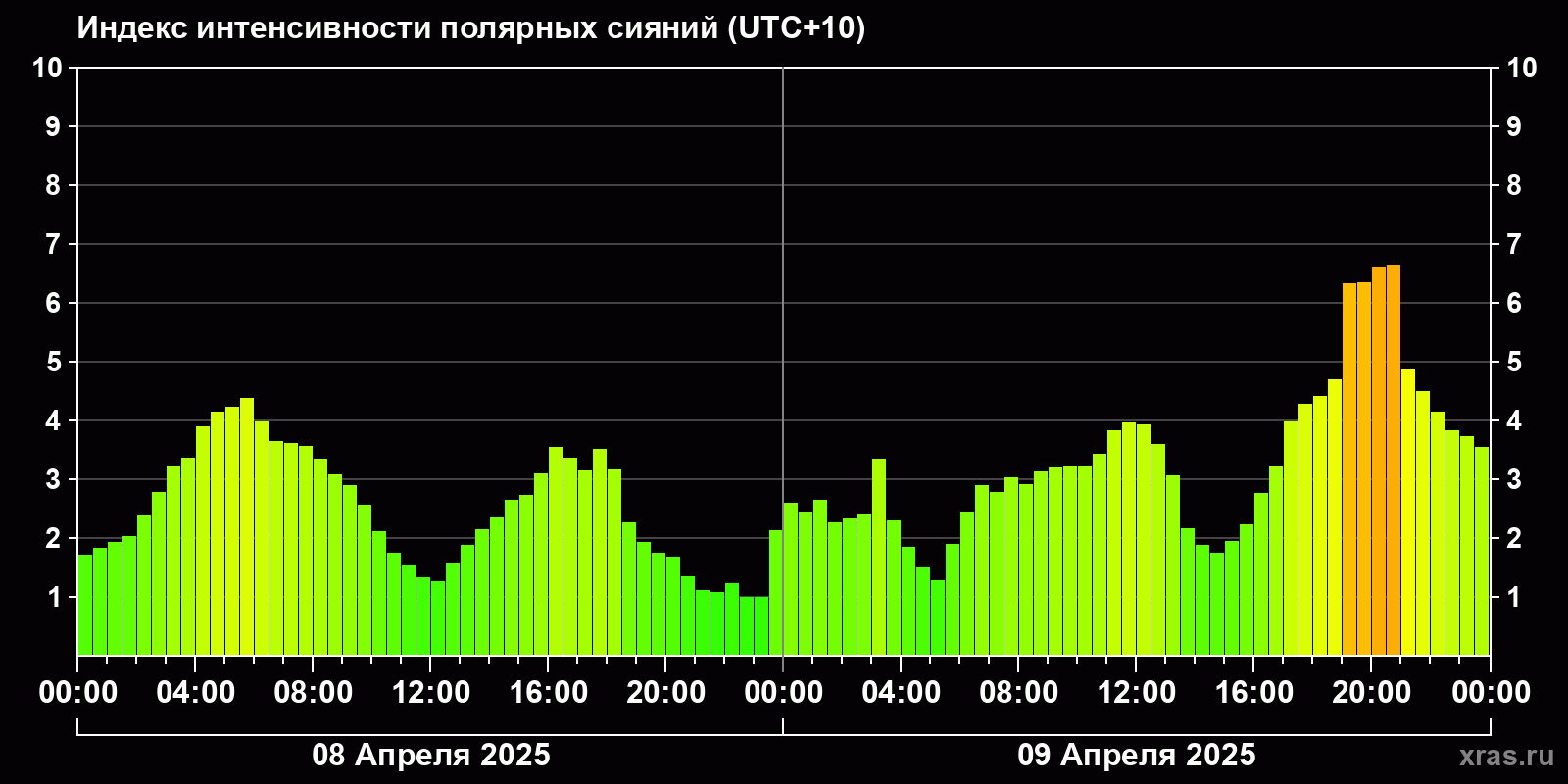 Изменения индекса интенсивности полярных сияний с 2025-04-08 по 2025-04-09 по местному времени