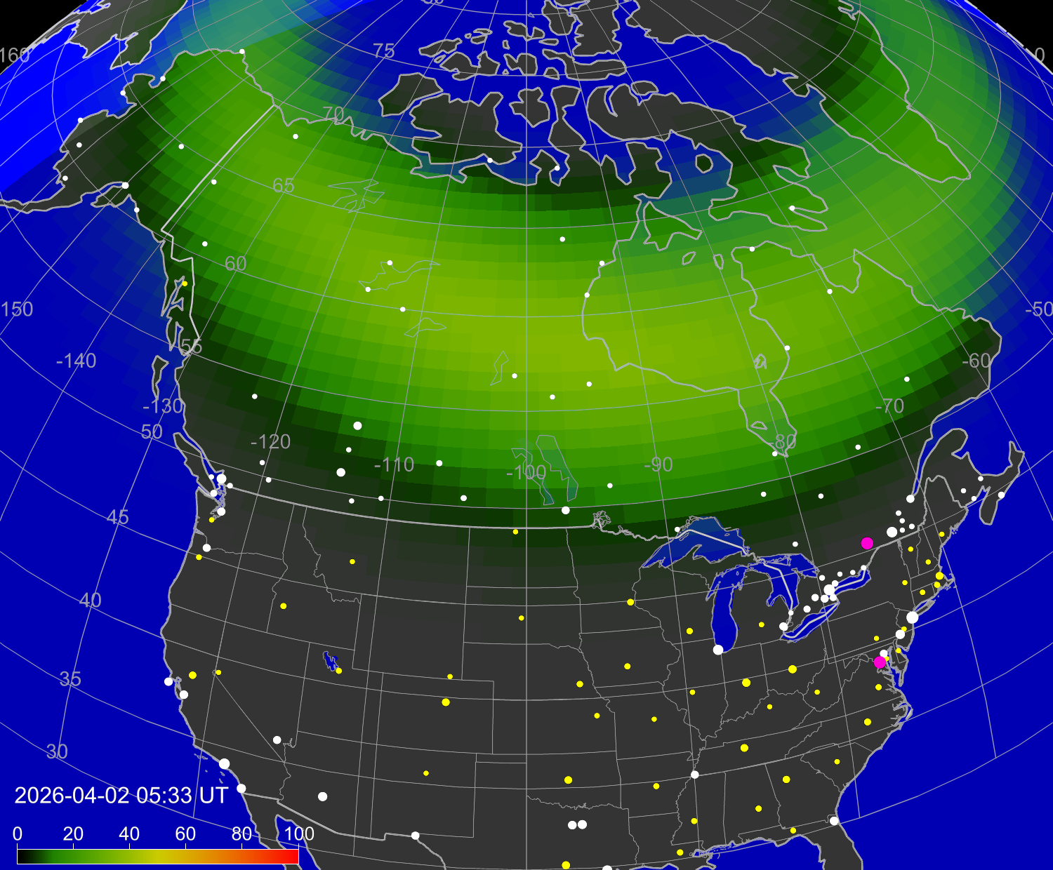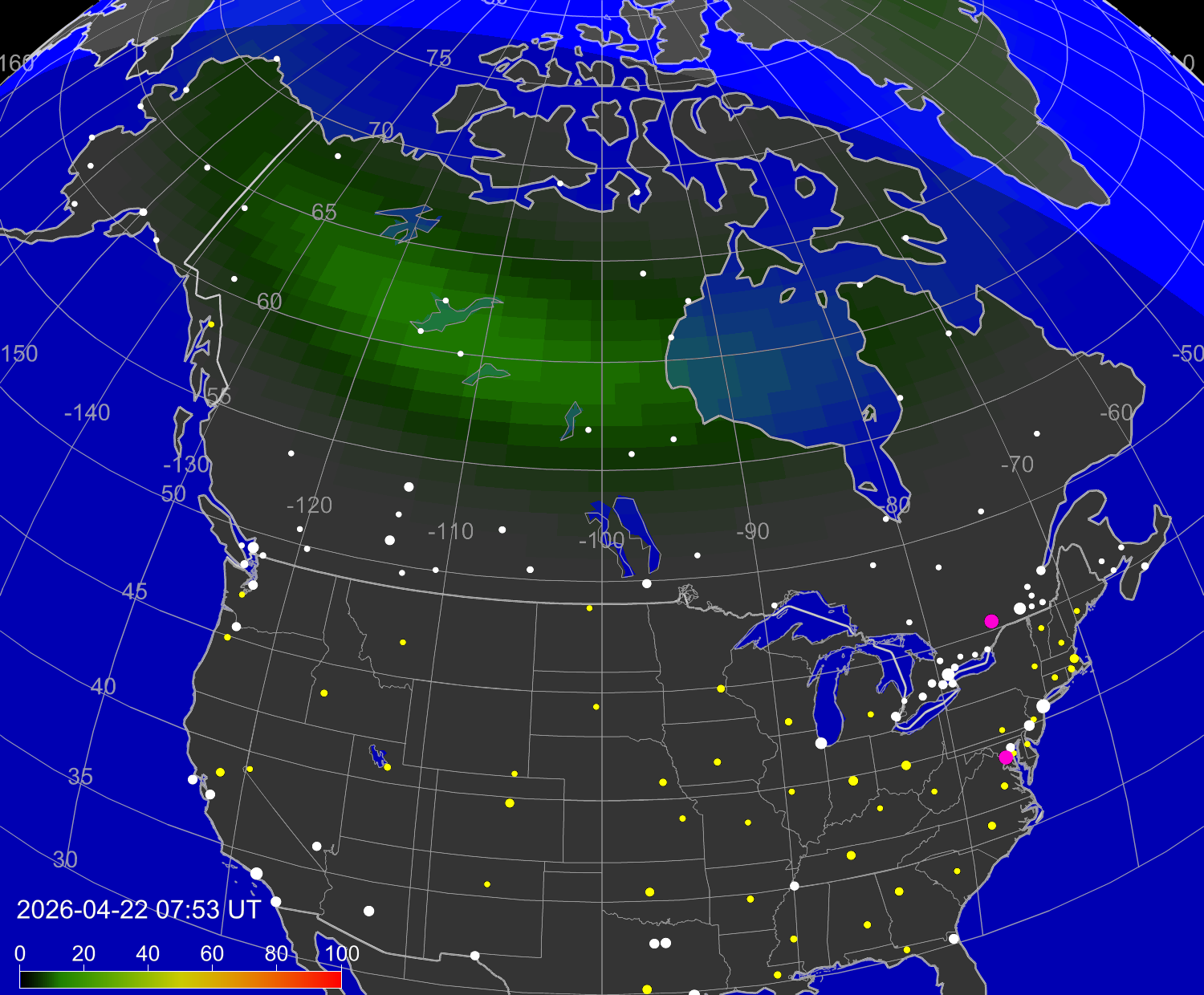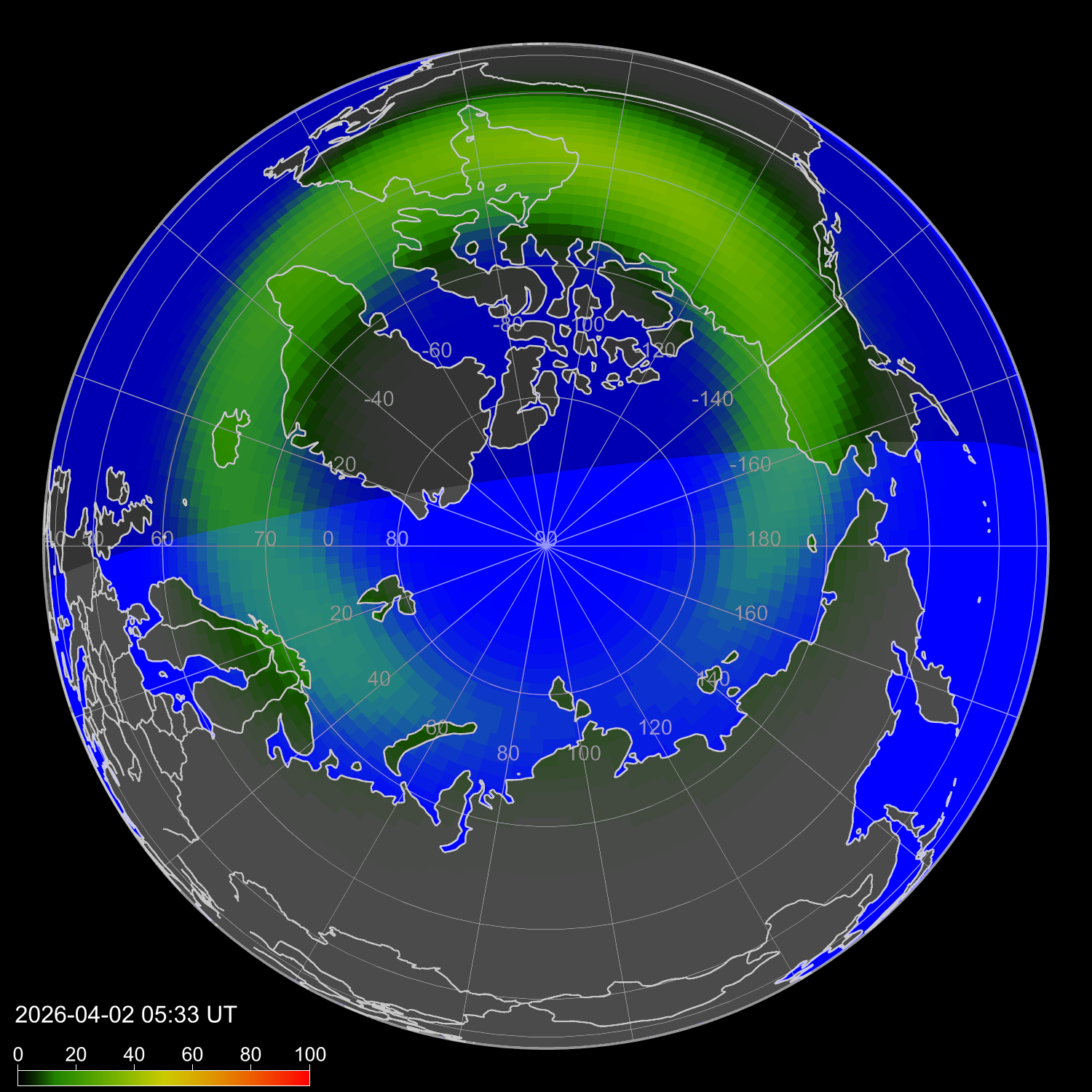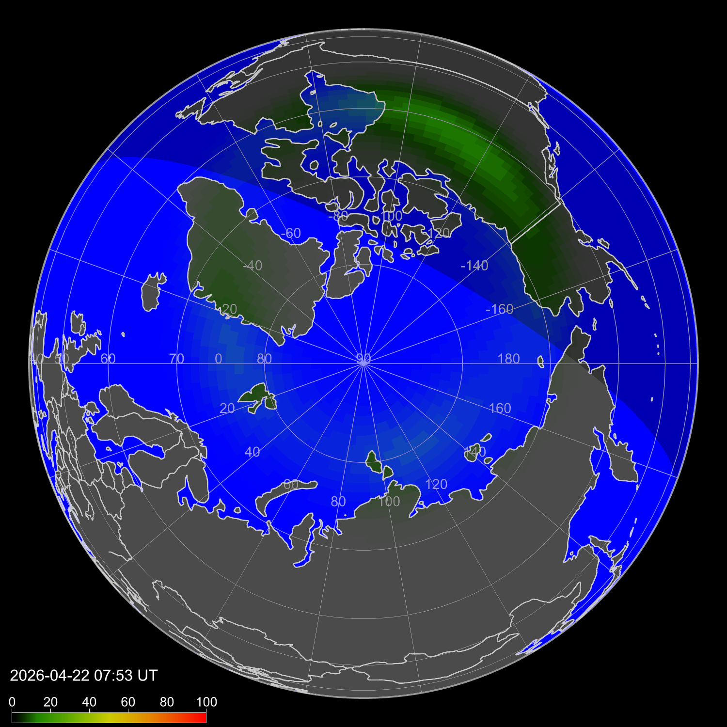 Индекс интенсивности полярных сияний и теоретически возможная широта наблюдений для ночного времени в западном полушарии