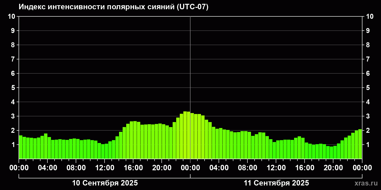 Изменения индекса интенсивности полярных сияний с 2025-09-10 по 2025-09-11 по местному времени