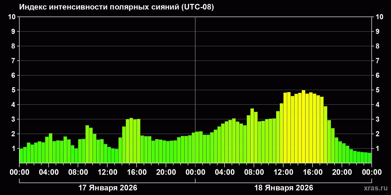 Изменения индекса интенсивности полярных сияний с 2026-01-17 по 2026-01-18 по местному времени
