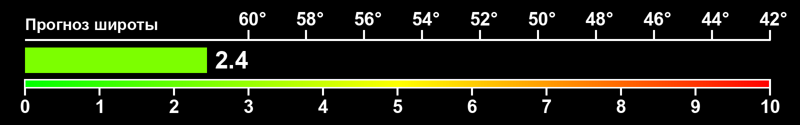 Индекс интенсивности полярных сияний и теоретически возможная широта наблюдений для ночного времени в западном полушарии по состоянию на 2026-02-23 23:51 (конец дня) по местному времени