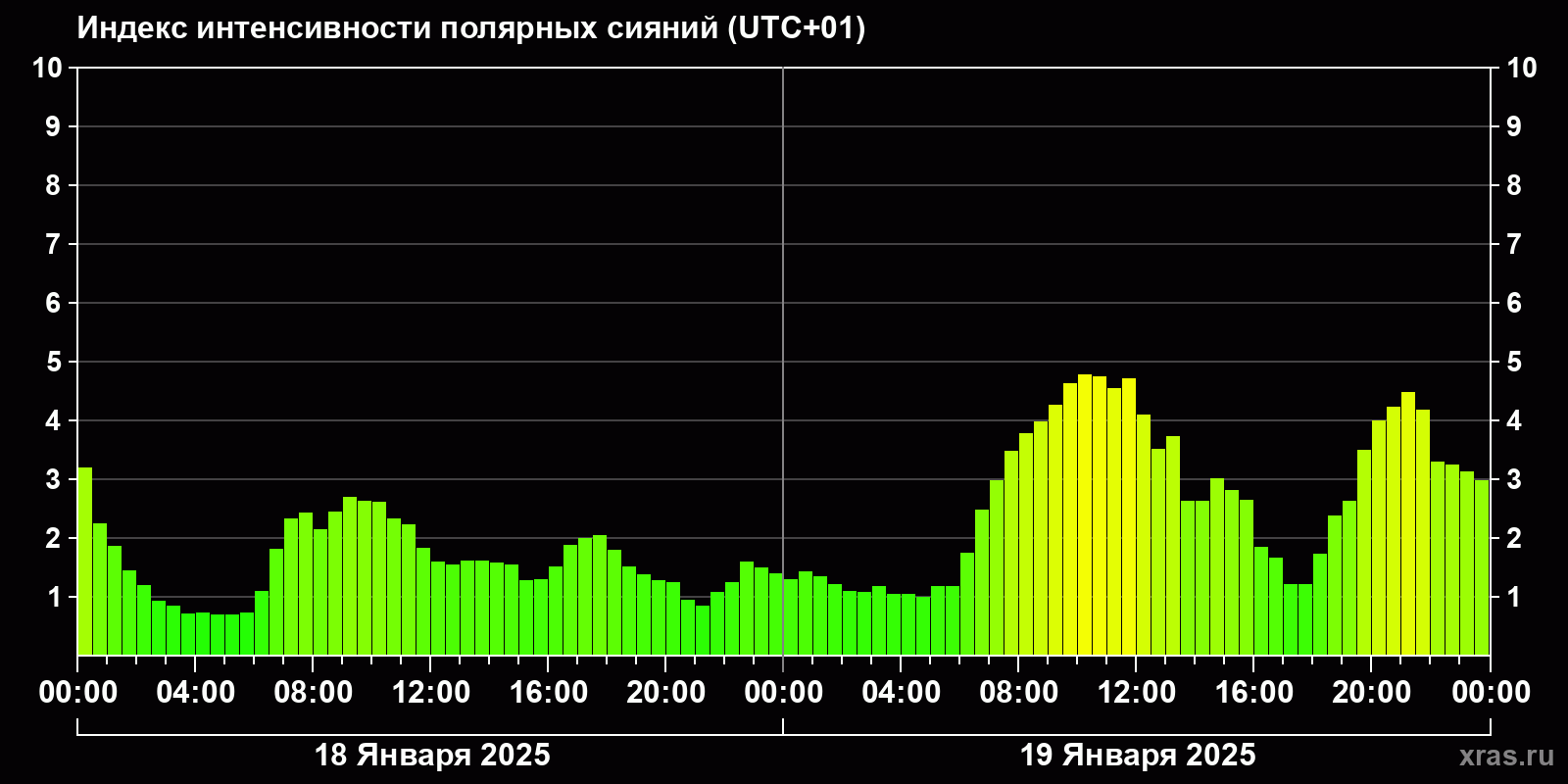 Изменения индекса интенсивности полярных сияний с 2025-01-18 по 2025-01-19 по местному времени