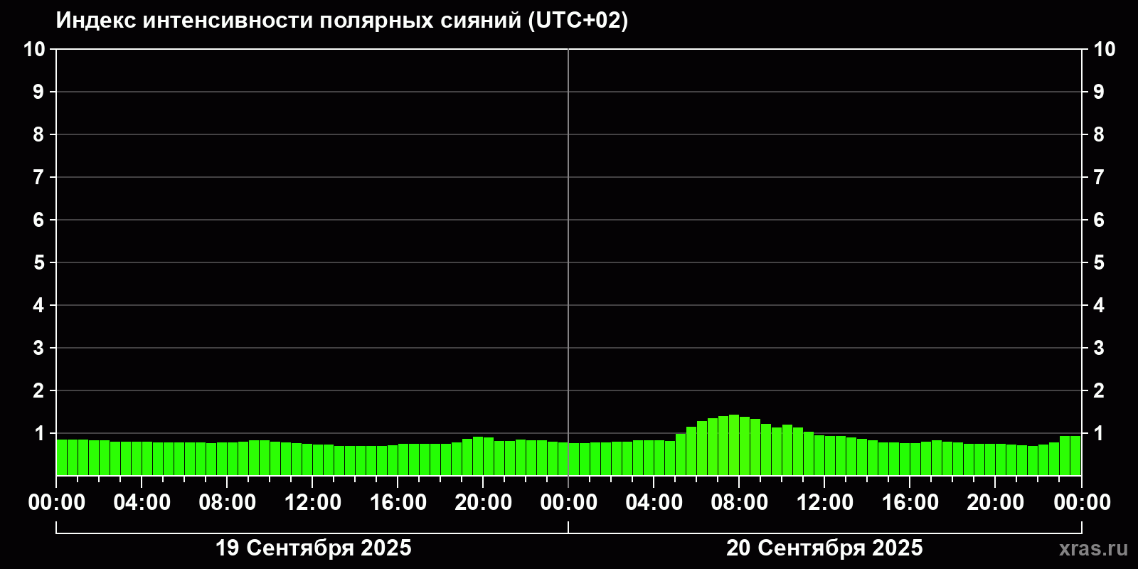 Изменения индекса интенсивности полярных сияний с 2025-09-19 по 2025-09-20 по местному времени