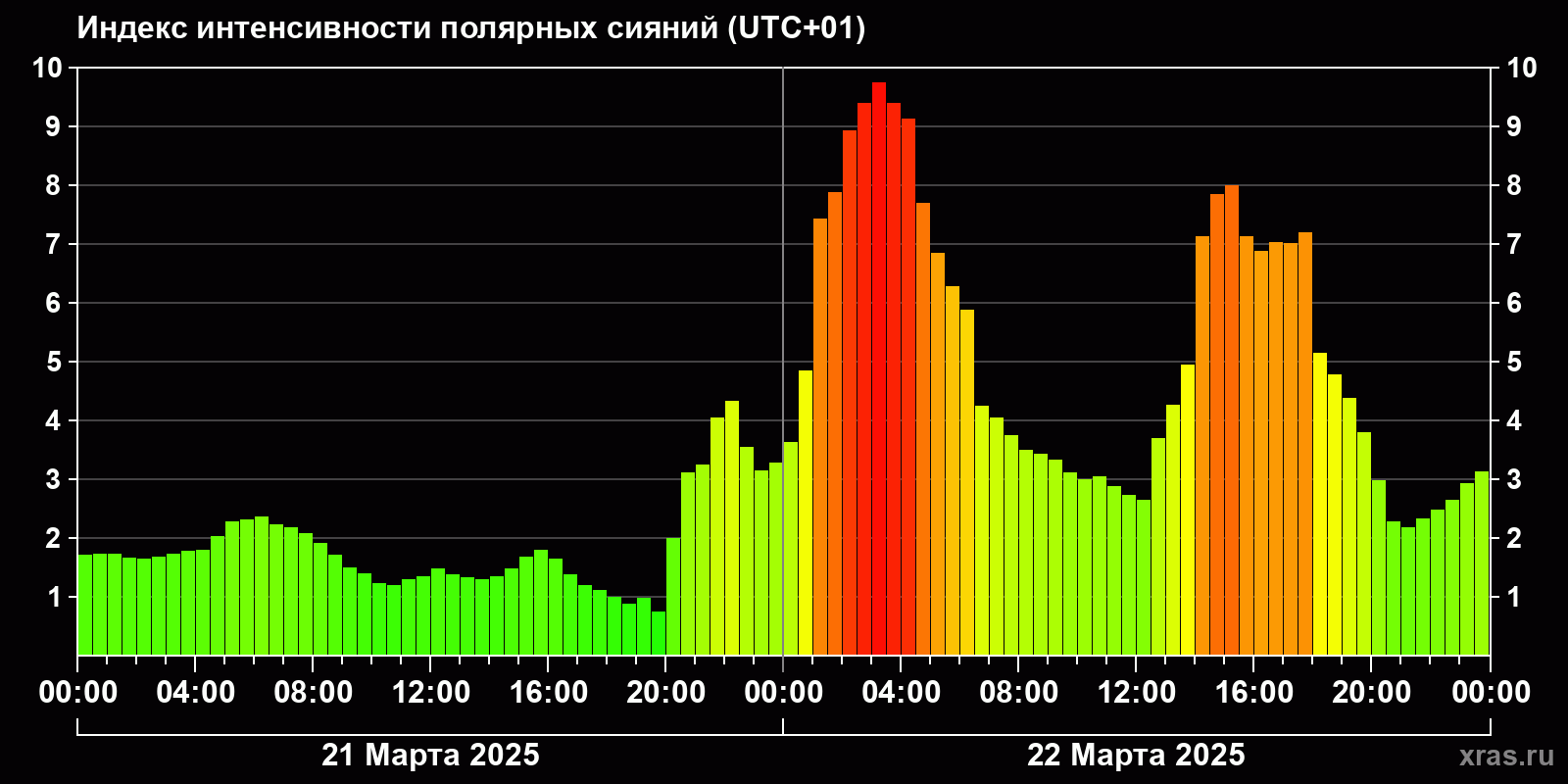 Изменения индекса интенсивности полярных сияний с 2025-03-21 по 2025-03-22 по местному времени