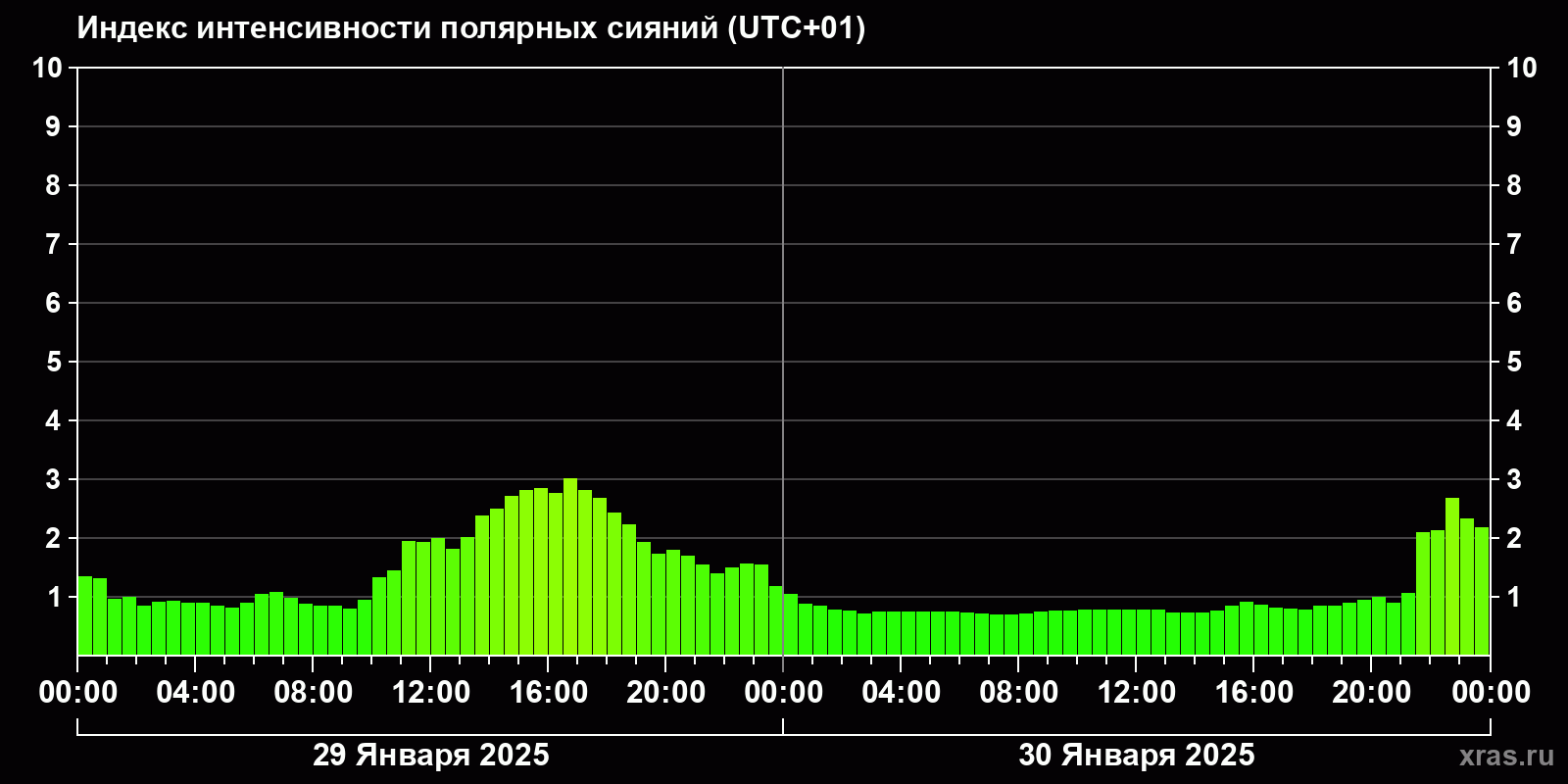 Изменения индекса интенсивности полярных сияний с 2025-01-29 по 2025-01-30 по местному времени