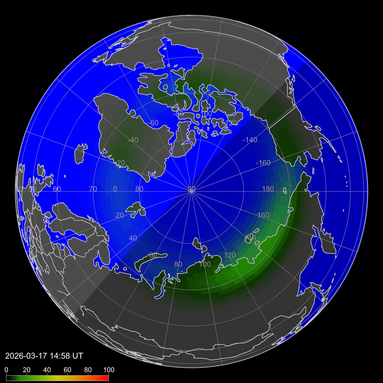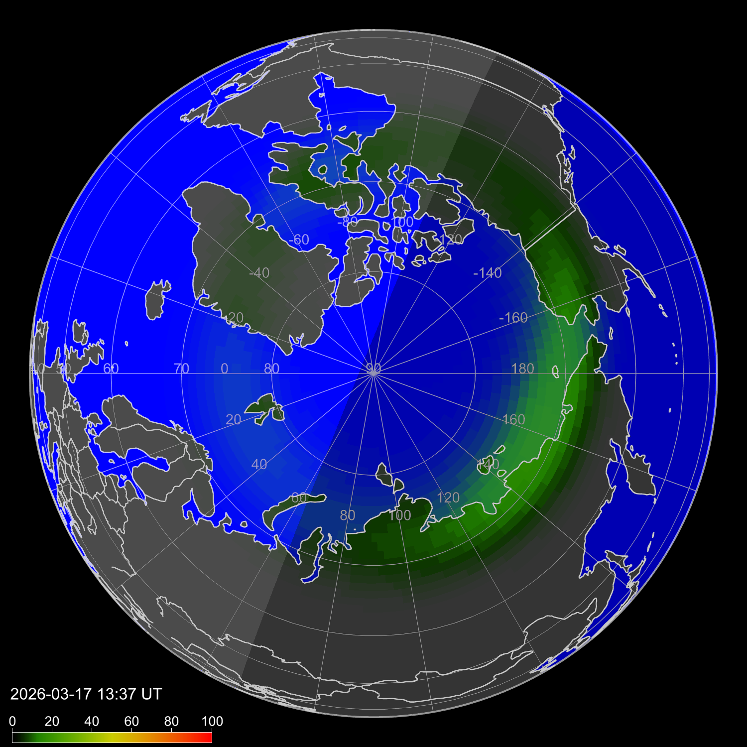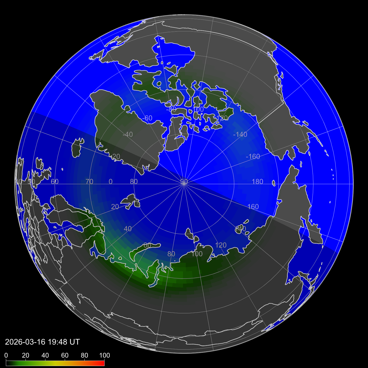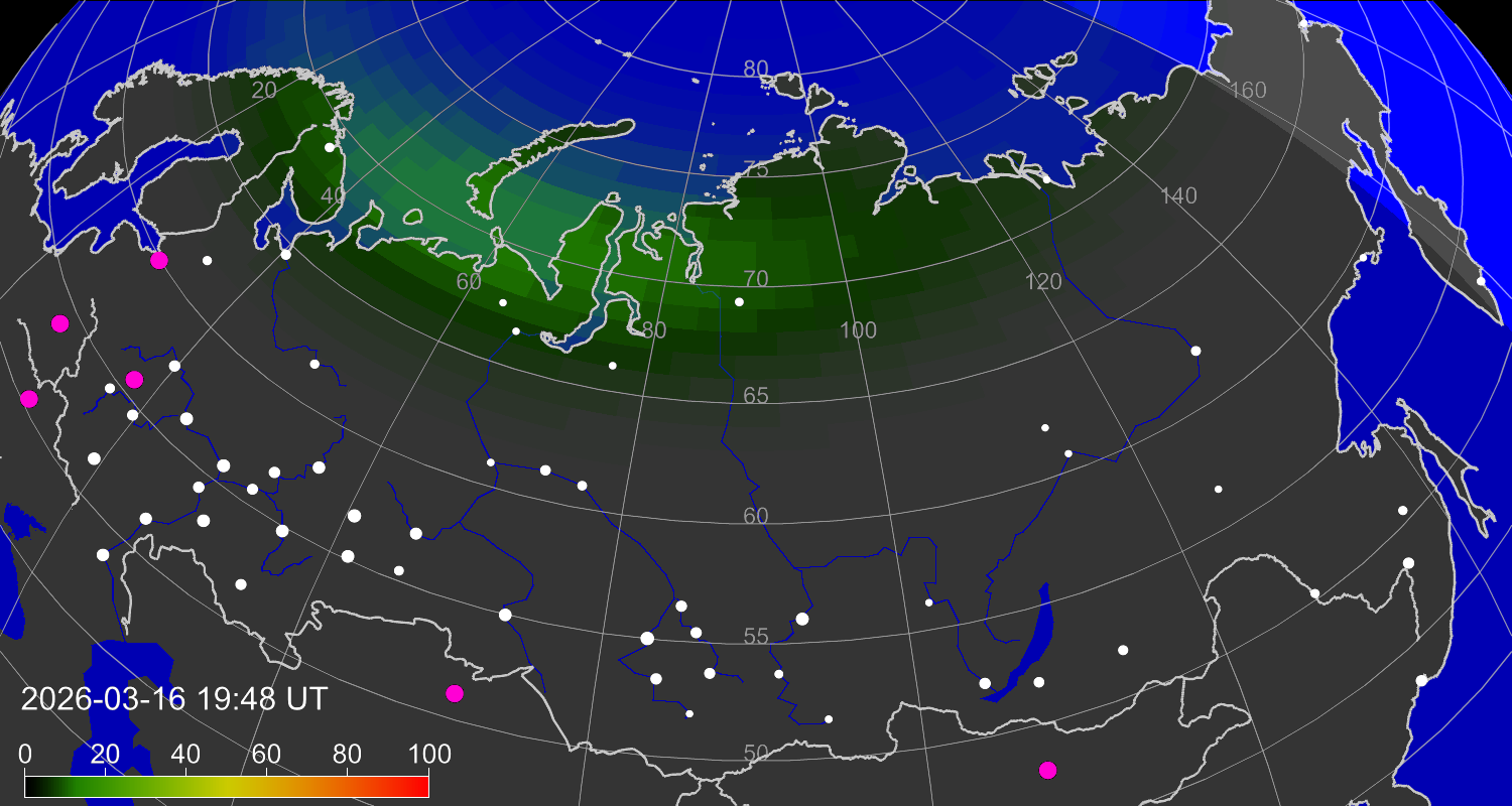 Изменения и часовой прогноз индекса интенсивности полярных сияний с 2026-03-16 по 2026-03-17