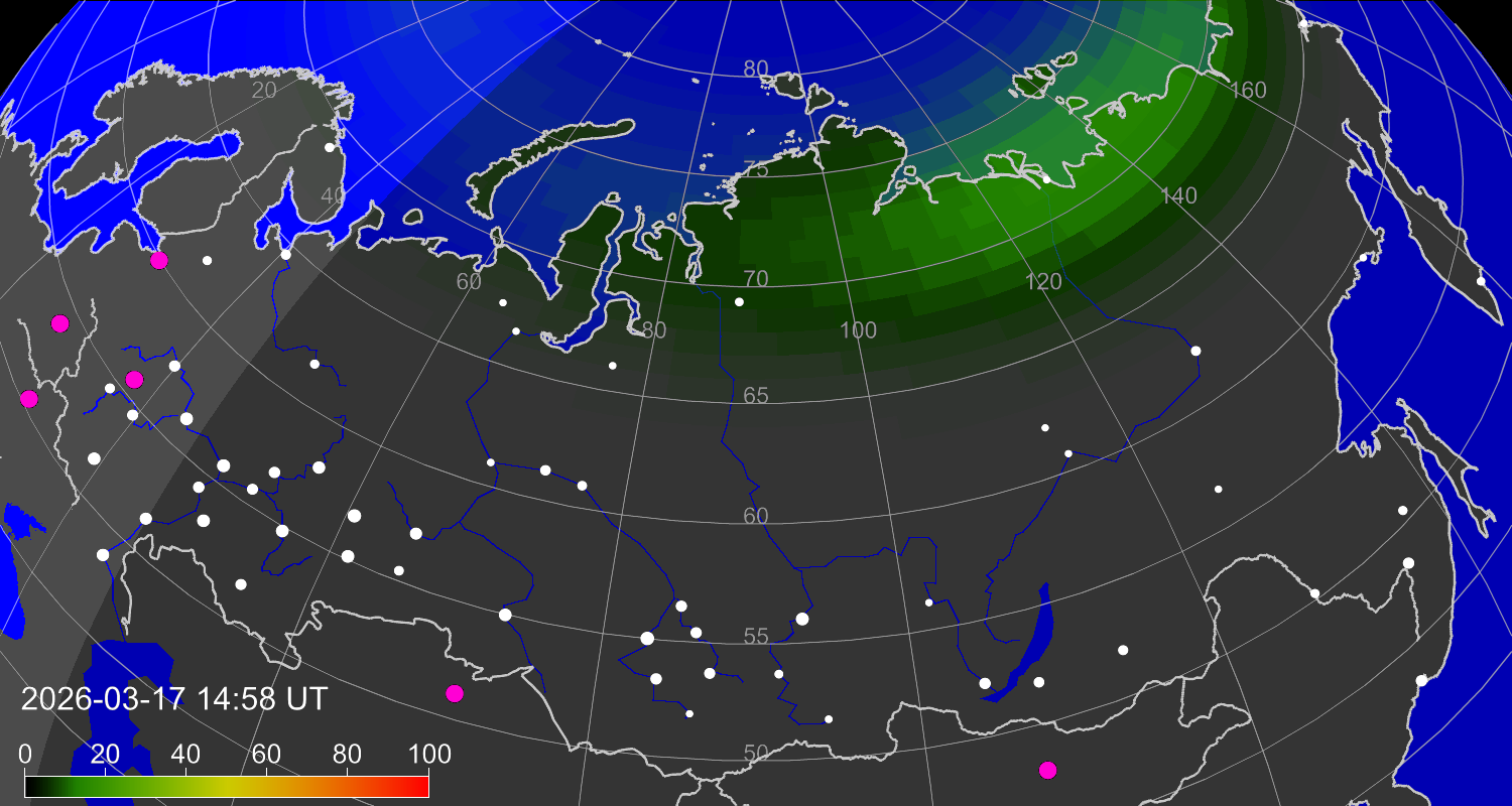Индекс интенсивности полярных сияний и теоретически возможная широта наблюдений для ночного времени в восточном полушарии