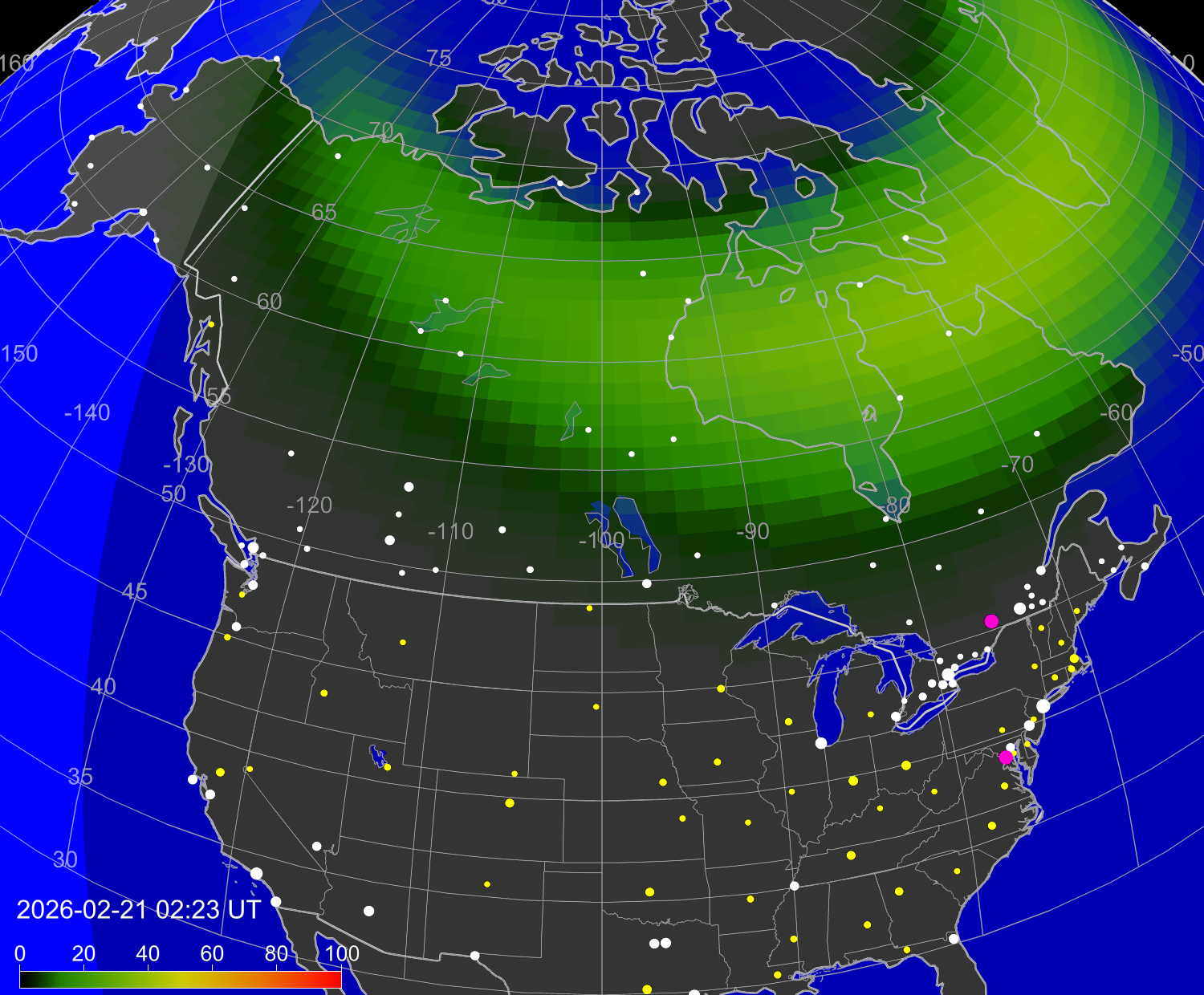 Вероятность полярных сияний в городах Канады
