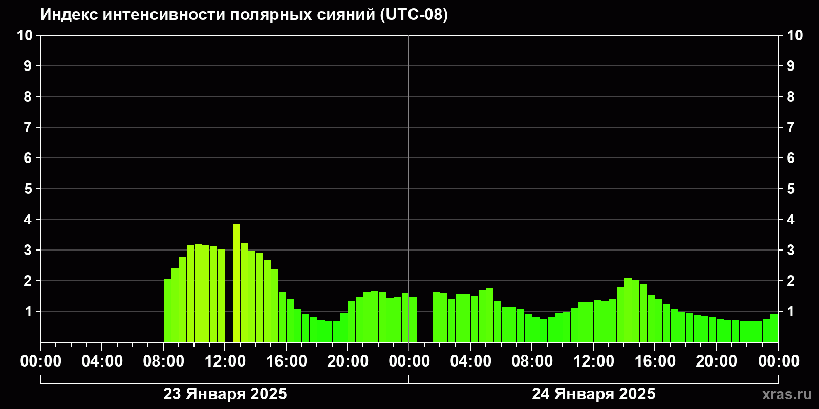 Изменения индекса интенсивности полярных сияний с 2025-01-23 по 2025-01-24 по местному времени