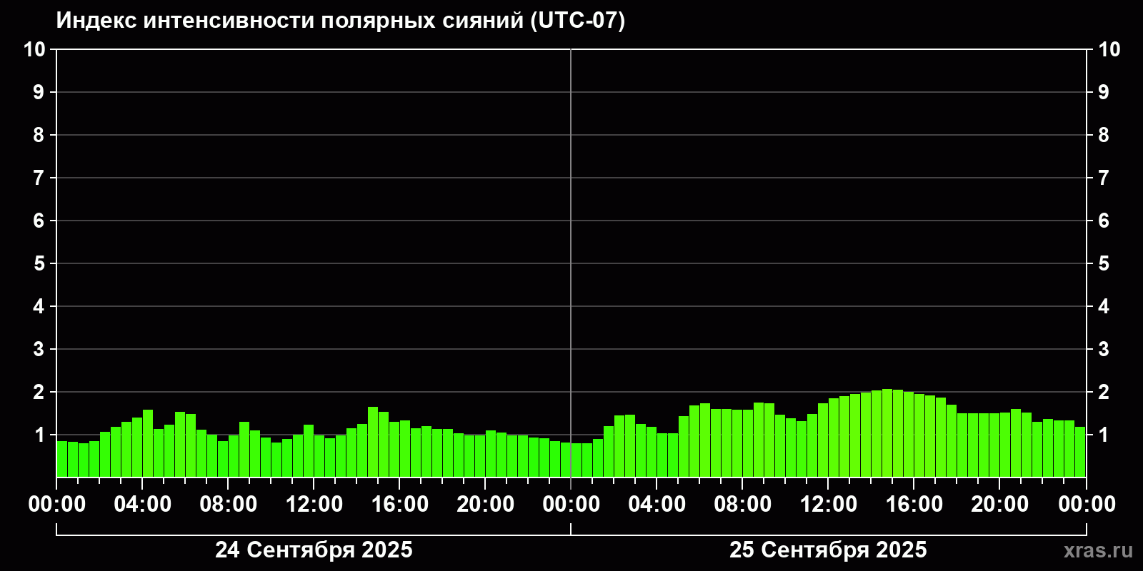 Изменения индекса интенсивности полярных сияний с 2025-09-24 по 2025-09-25 по местному времени