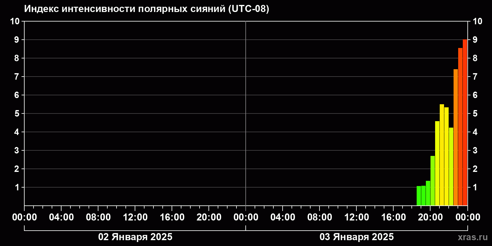 Изменения индекса интенсивности полярных сияний с 2025-01-02 по 2025-01-03 по местному времени