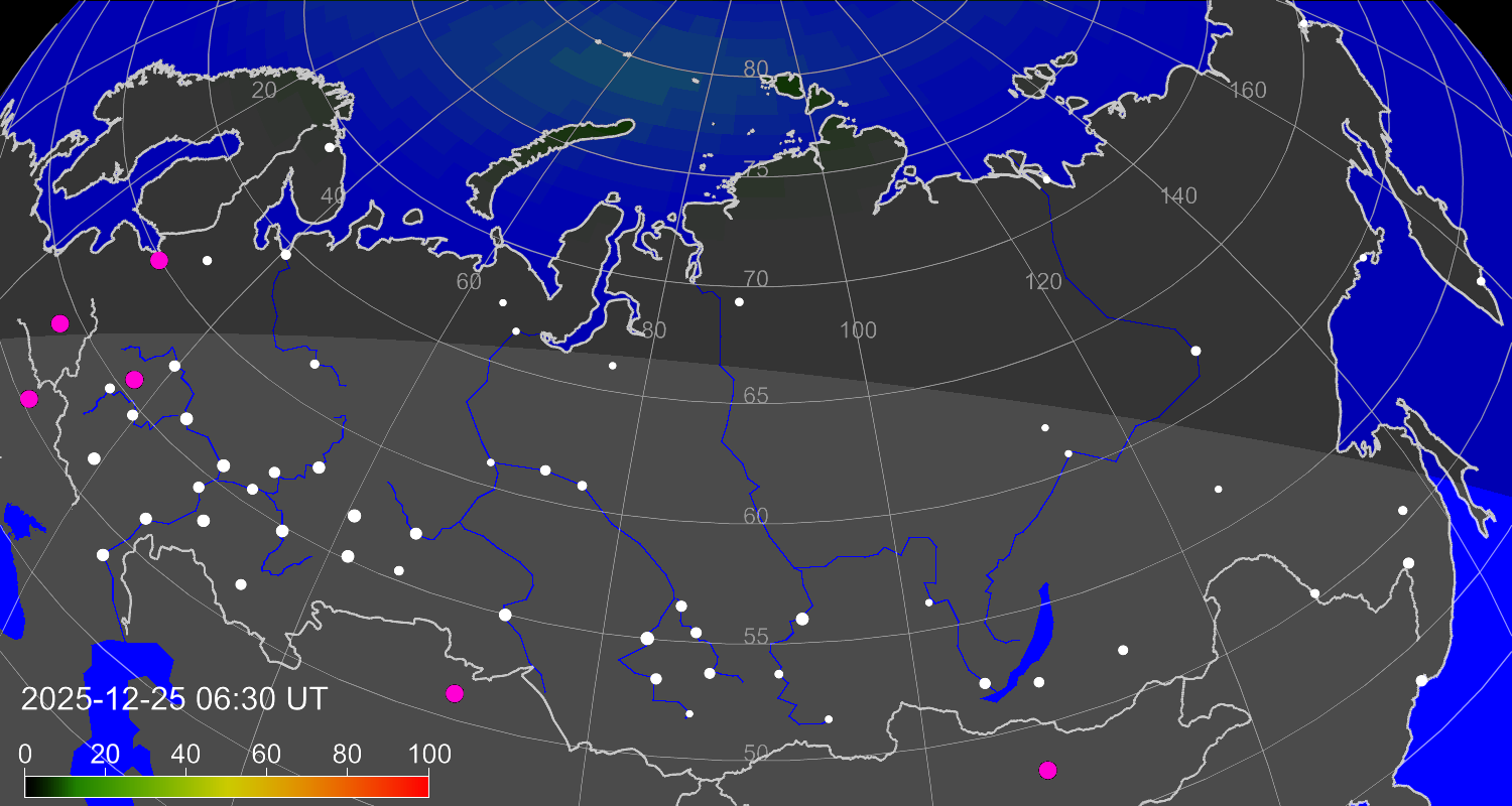 Индекс интенсивности полярных сияний и теоретически возможная широта наблюдений для ночного времени в восточном полушарии