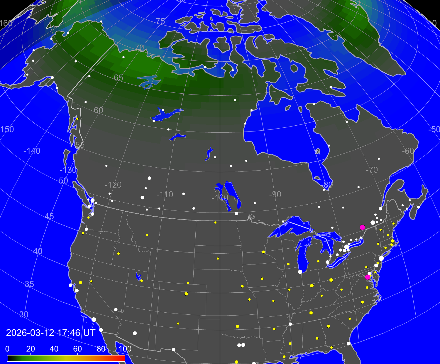 Зона полярных (северных) сияний над территорией Северной Америки