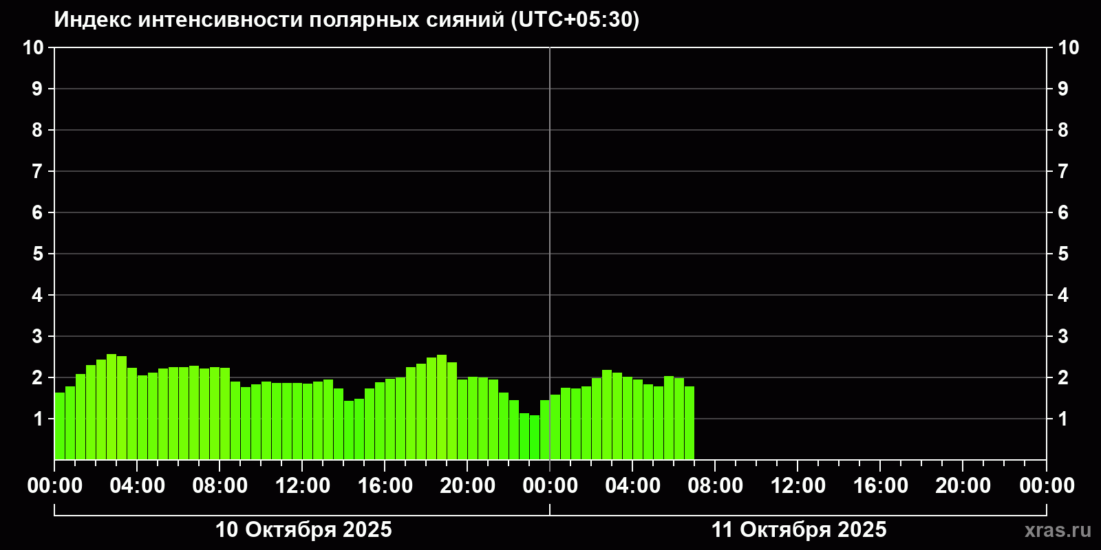 Изменения и часовой прогноз индекса интенсивности полярных сияний с 2025-10-10 по 2025-10-11
