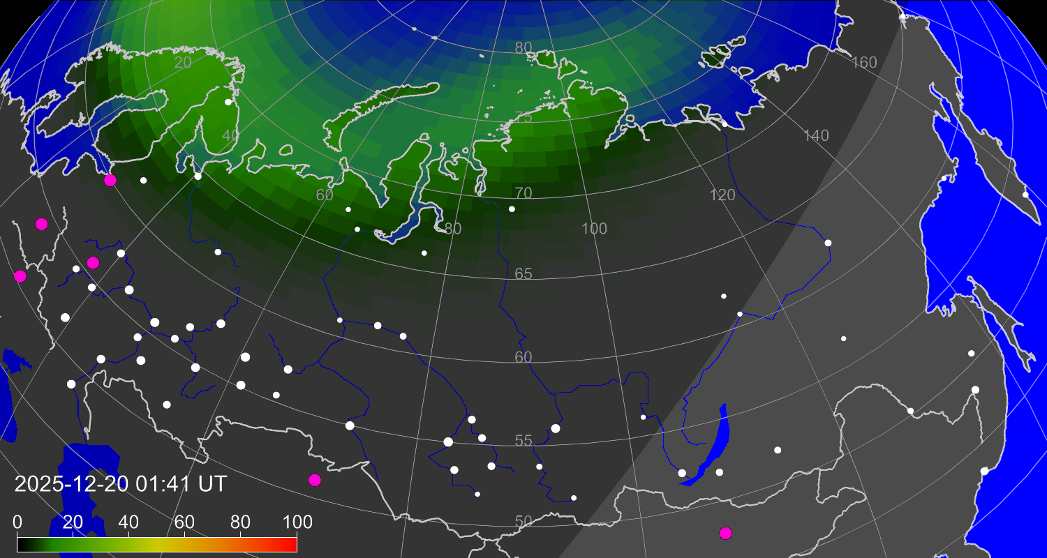 Индекс интенсивности полярных сияний и теоретически возможная широта наблюдений для ночного времени в восточном полушарии