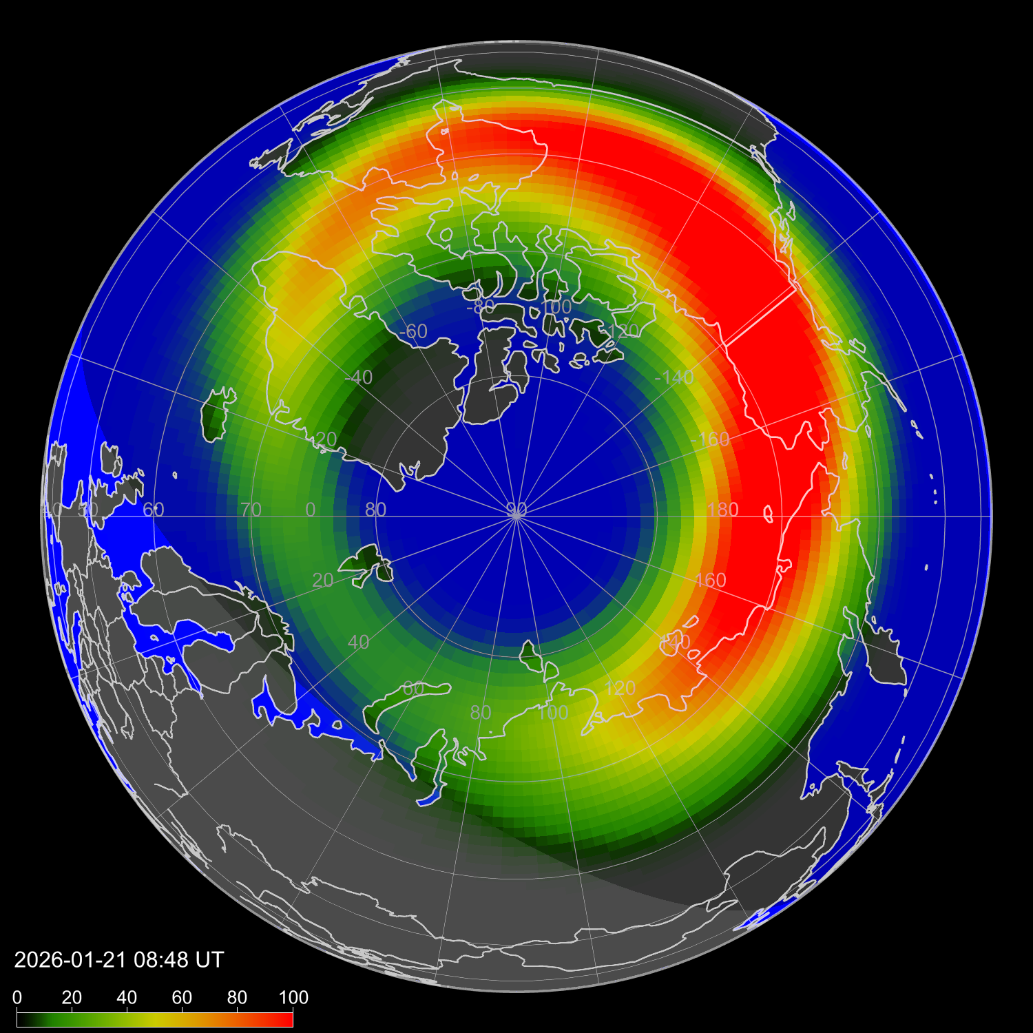 Индекс интенсивности полярных сияний и теоретически возможная широта наблюдений для ночного времени в западном полушарии