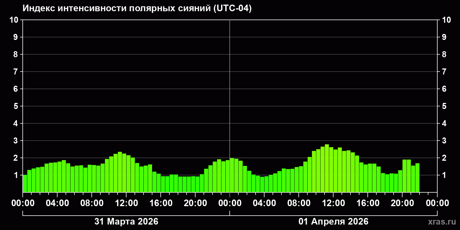 Изменения индекса интенсивности полярных сияний с 2026-03-31 по 2026-04-01 по местному времени