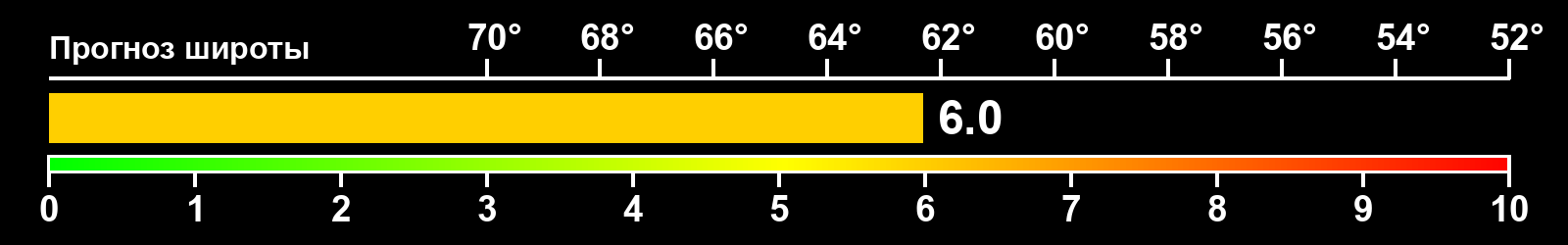 Индекс интенсивности полярных сияний и теоретически возможная широта наблюдений для ночного времени в восточном полушарии по состоянию на 2026-01-23 23:57 (конец дня) по местному времени
