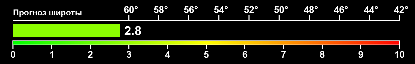 Индекс интенсивности полярных сияний и теоретически возможная широта наблюдений для ночного времени в западном полушарии по состоянию на 2026-02-18 23:52 (конец дня) по местному времени
