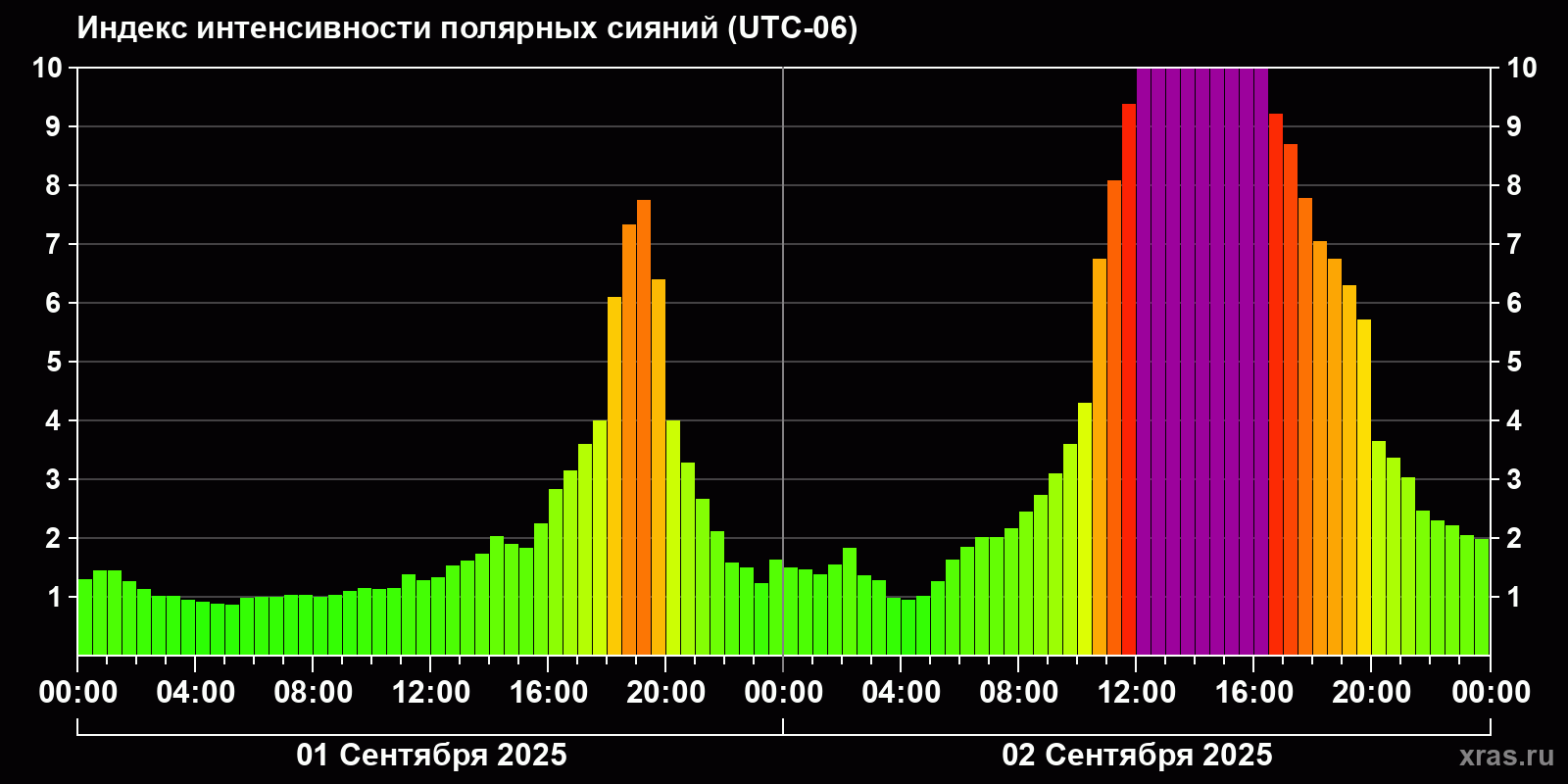 Изменения индекса интенсивности полярных сияний с 2025-09-01 по 2025-09-02 по местному времени