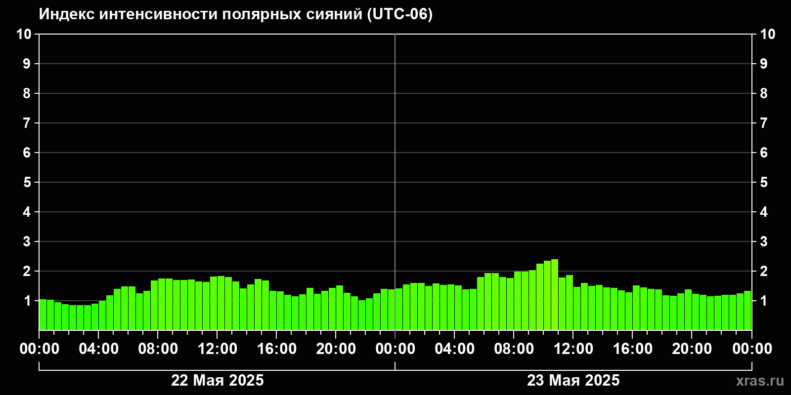 Изменения индекса интенсивности полярных сияний с 2025-05-22 по 2025-05-23 по местному времени
