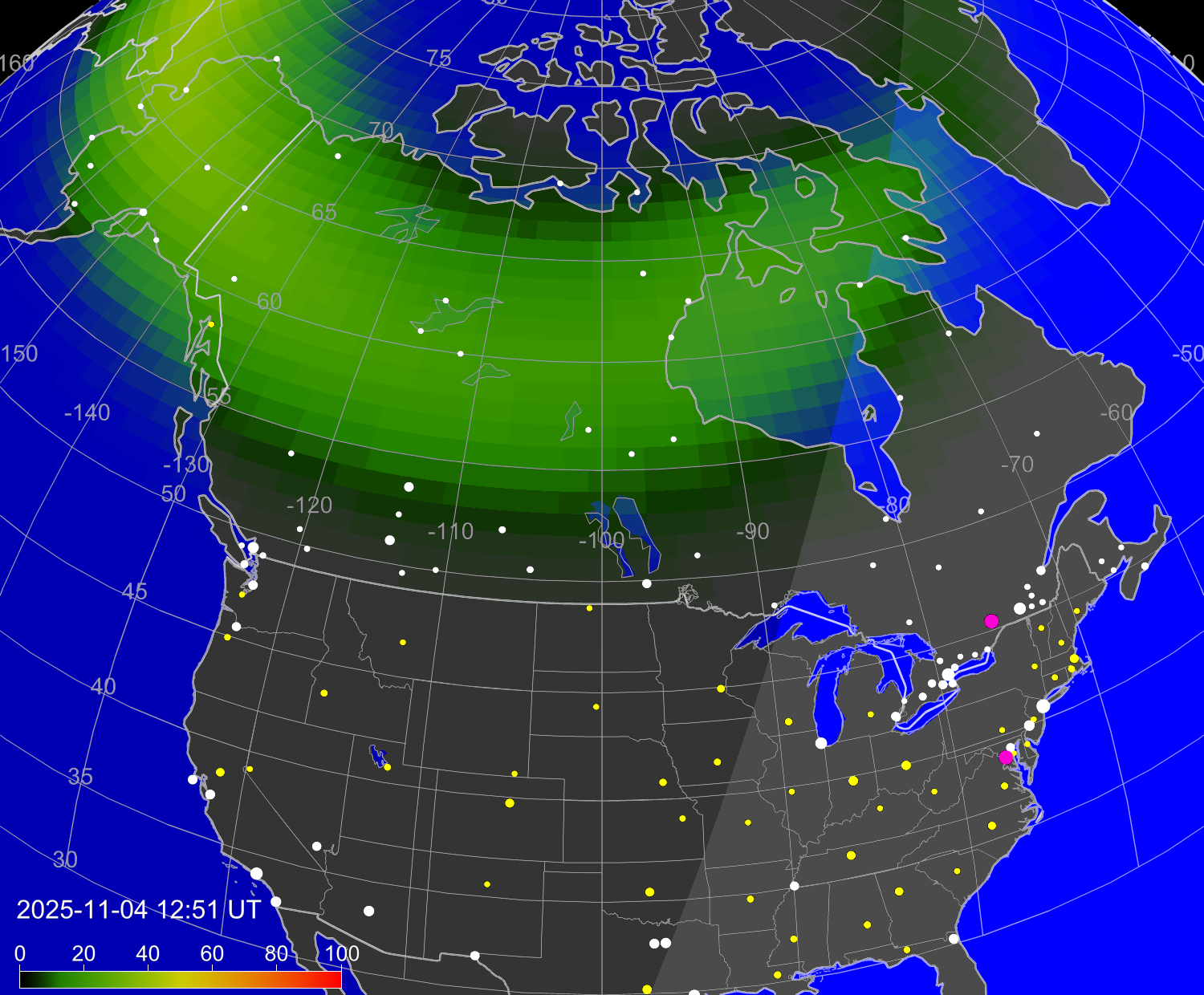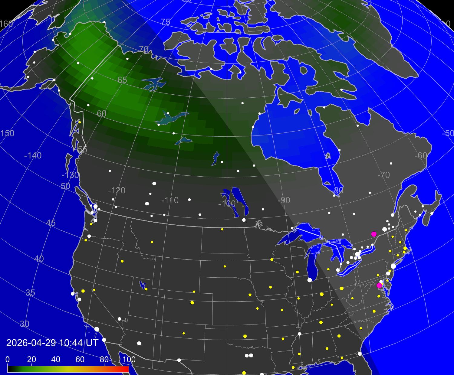 Вероятность полярных сияний в городах Канады