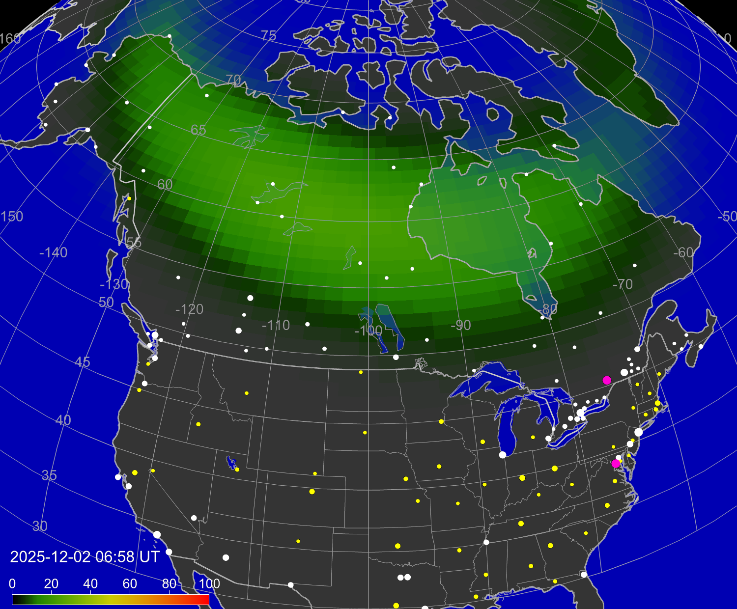 Изменения и часовой прогноз индекса интенсивности полярных сияний с 2025-11-30 по 2025-12-01