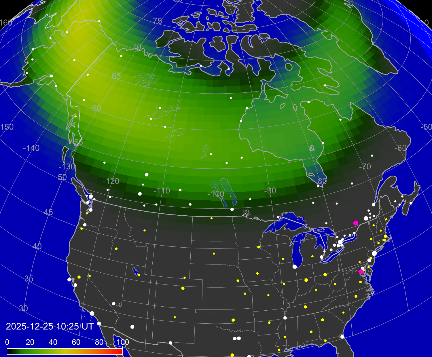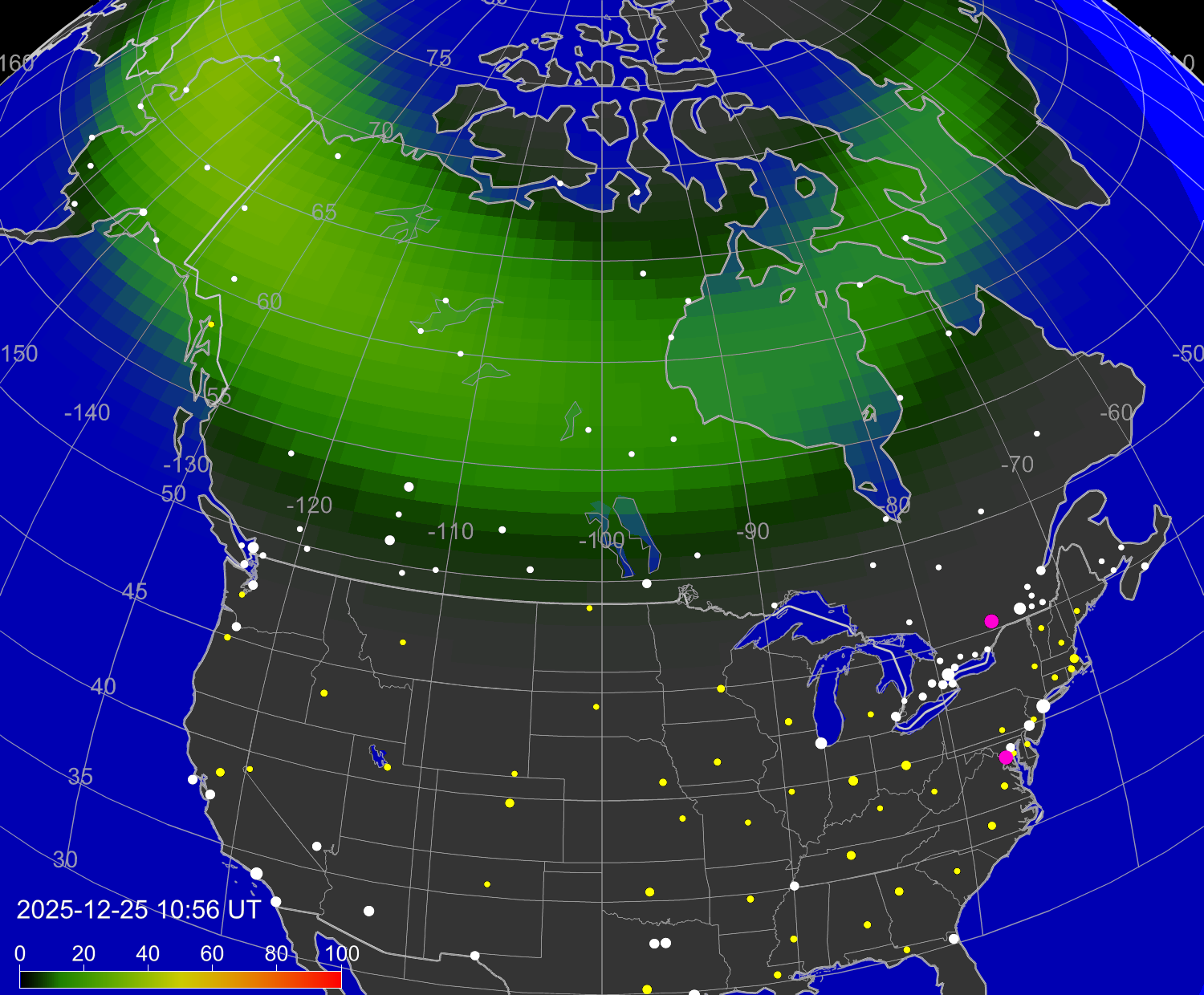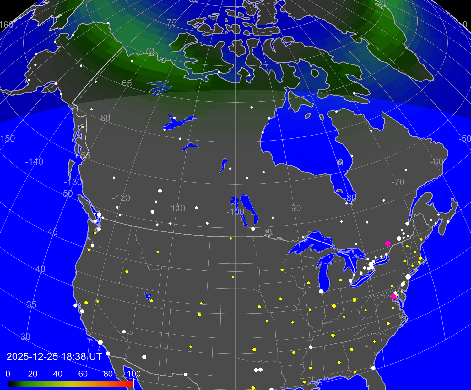 Вероятность полярных сияний в городах Канады
