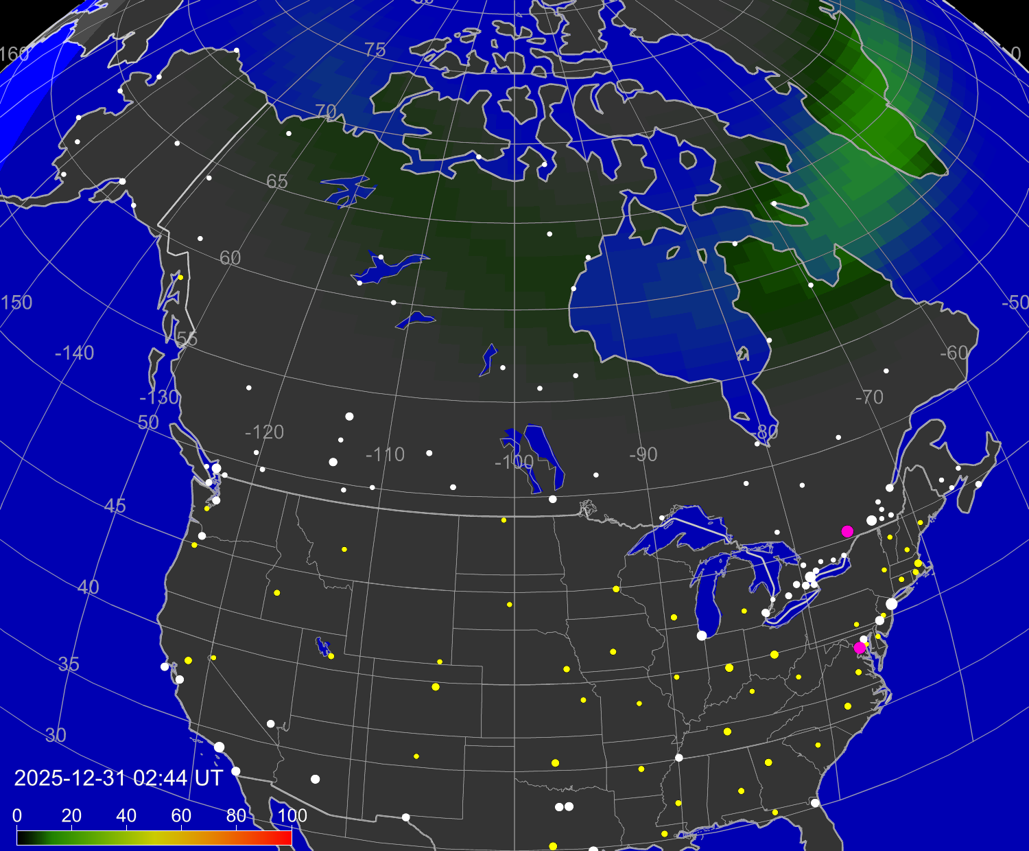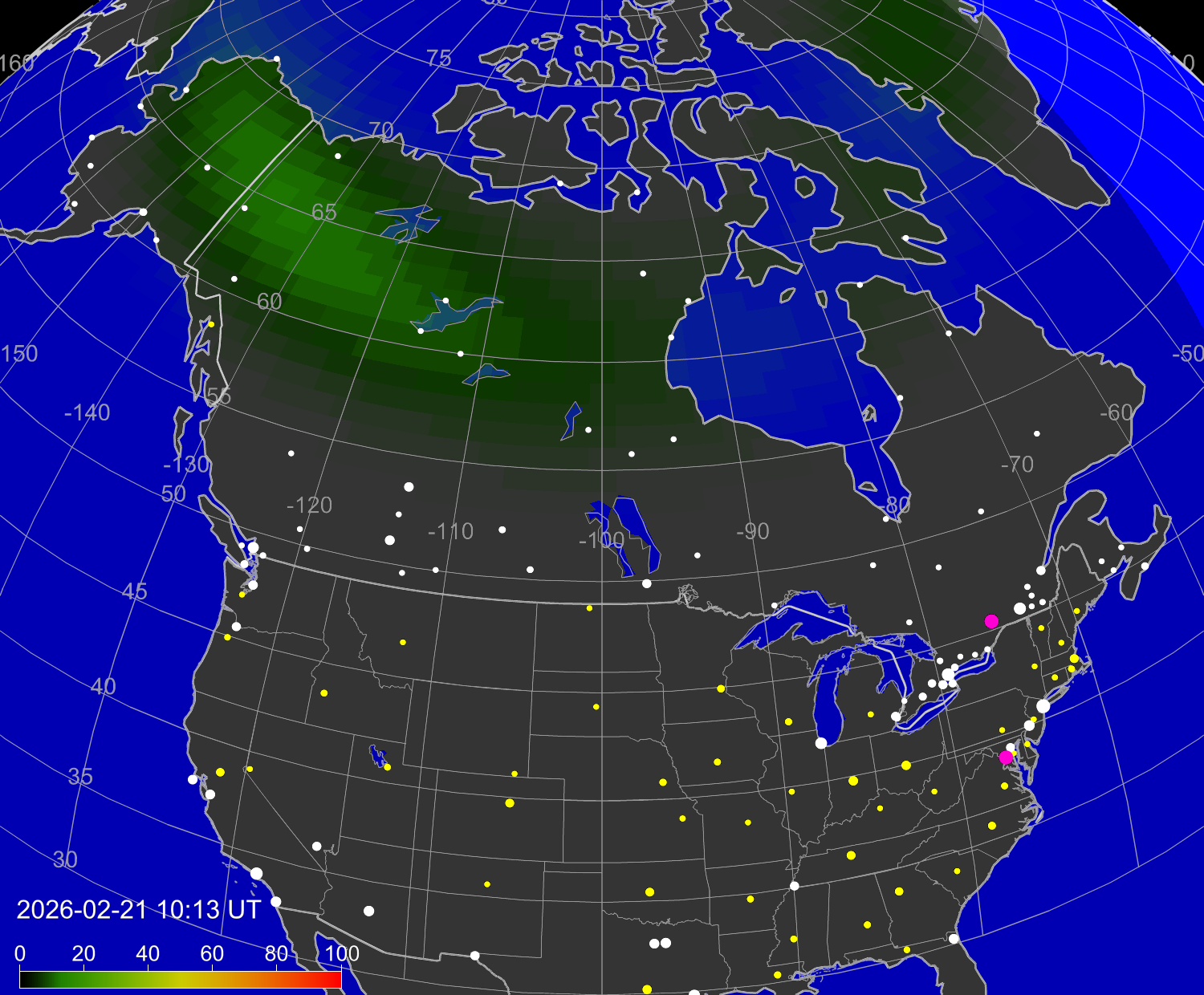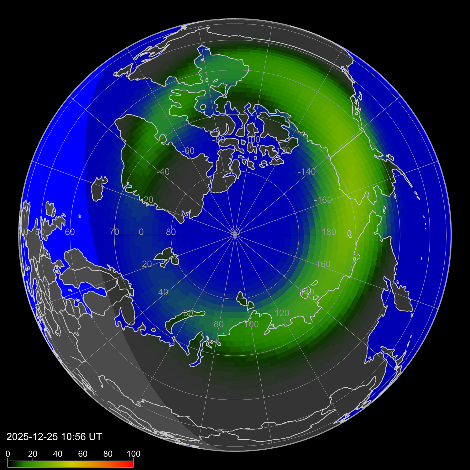 Индекс интенсивности полярных сияний и теоретически возможная широта наблюдений для ночного времени в западном полушарии