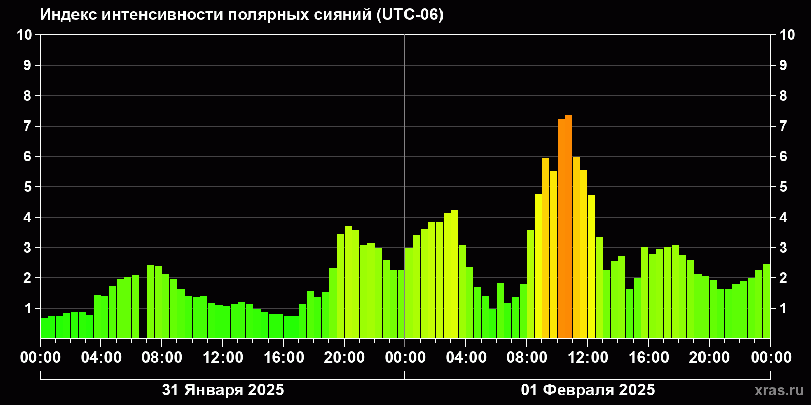 Изменения индекса интенсивности полярных сияний с 2025-01-31 по 2025-02-01 по местному времени