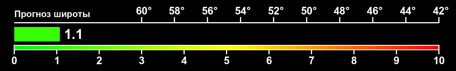 Индекс интенсивности полярных сияний и теоретически возможная широта наблюдений для ночного времени в западном полушарии по состоянию на 2026-03-05 23:55 (конец дня) по местному времени
