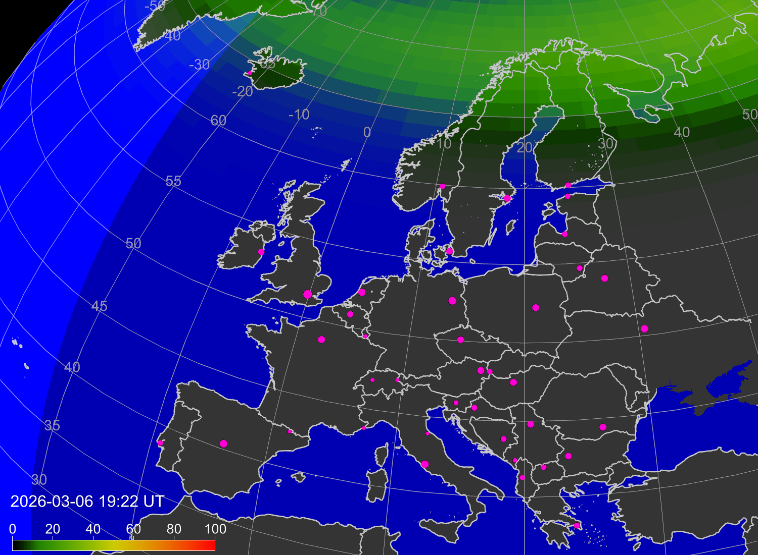 Вероятность полярных сияний в городах Европы