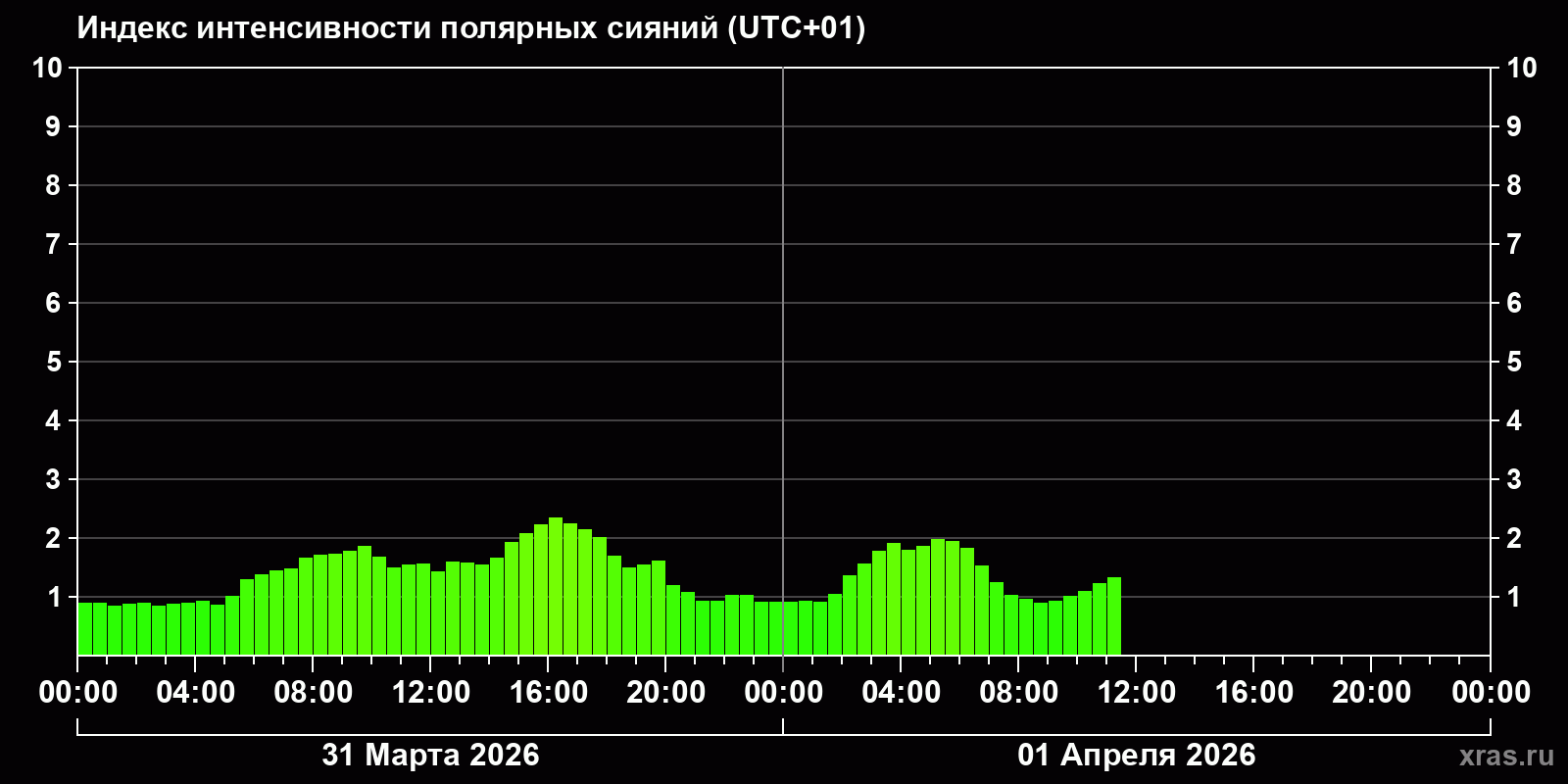 Изменения индекса интенсивности полярных сияний с 2026-03-31 по 2026-04-01 по местному времени
