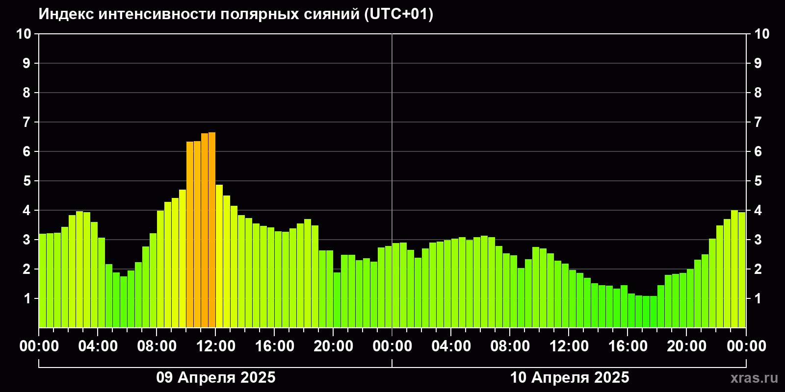 Изменения индекса интенсивности полярных сияний с 2025-04-09 по 2025-04-10 по местному времени