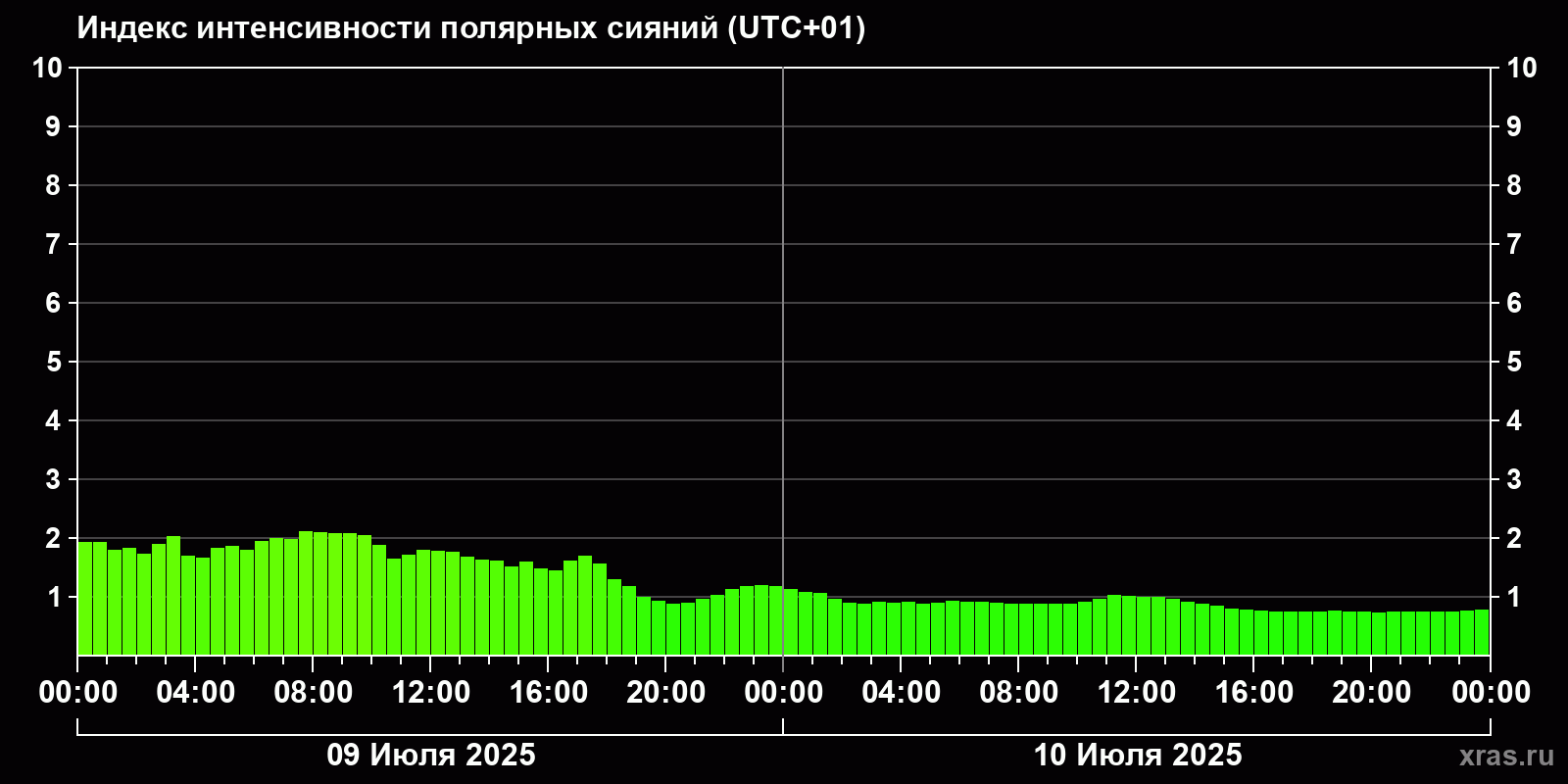 Изменения индекса интенсивности полярных сияний с 2025-07-09 по 2025-07-10 по местному времени