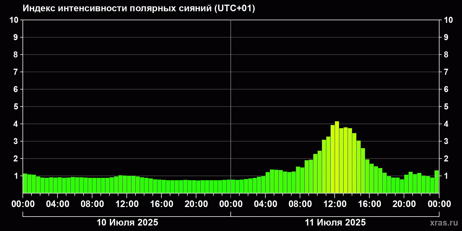 Изменения индекса интенсивности полярных сияний с 2025-07-10 по 2025-07-11 по местному времени